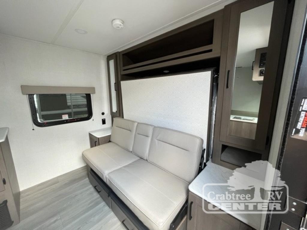 This is the perfect couple's trailer with versatile seating and sleeping space! You'll find a queen-size Murphy bed up front with storage space beside and above plus a full rear bath for added privacy. Once you've made lunch in the full kitchen, you can dine at the booth dinette, or take your plate outdoors to sit under the 10' power awning with an LED light. You'll also find an unobstructed pass-thru storage outside that will be perfect for fishing poles, lawn chairs, tools and more!