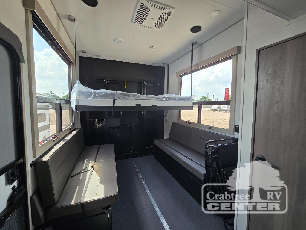 You want a toy hauler to carry your toys to the trails, and include many at-home comforts, and that's just what this unit delivers. A 14' separate garage includes an adjustable tie-down system, an optional Lifesuite System for more sleeping space, an optional half bath, plus washer and dryer prep. There is an overhead loft bed and an L-shaped sofa with recline in the main living area that offers sleeping space as well. Everyone can watch a movie on the LED TV with a fireplace below while sitting on the sofa, in the theatre seats, or while at the free standing dinette with four chairs. The chef will have upgraded appliances to make meals for everyone, an L-shaped countertop with a kitchen sink, and a USB charging outlet. You will love the shower with seat in the full bathroom with two space savings sliding doors that lead into the hallway, and into the front bedroom where you will have a walk-around queen bed, a slide out wardrobe and more USB charging outlets.