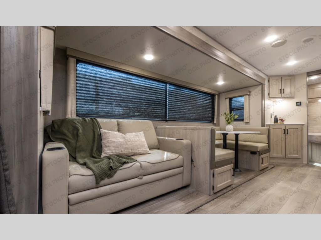 This travel trailer is perfect for your whole crew! Once you arrive at the campground, you can put out the 21' electric awning and start lunch on the exterior camper kitchen with a griddle and mini fridge. There is also a pass-thru storage plus additional exterior storage with a fold-down table and a TV hookup for added convenience. And since there are dual entry doors found on this unit, you can enter in through the full bath in the back, or the main living area towards the front! A large slide provides ample space to move about, and you'll find a trundle sofa and U-shaped dinette here for cozy seating and sleeping space. Speaking of sleeping, there is a front RV queen bed in the bedroom plus double-size bunks in the back for guests!