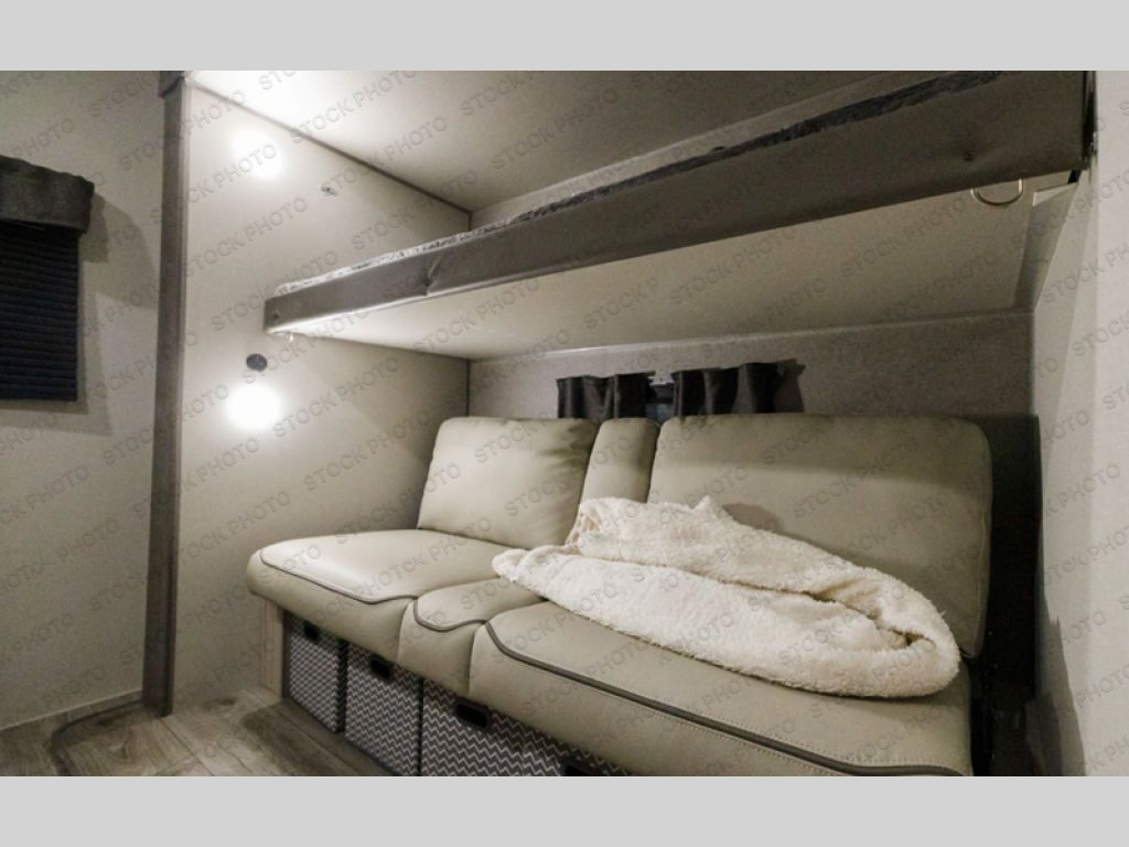 This family-friendly trailer offers lots of floor space thanks to the triple slides throughout! You and your family will love the combined living and kitchen area with a slide out booth dinette and a sofa with drink holders. The L-shaped kitchen counter allows the cook to make meals without moving for anyone trying to get to the full bathroom or the rear bunkhouse. The kids will have their own privacy, two bunk beds, a jack knife sofa with storage totes below plus a TV/wardrobe cabinet. The front private bedroom allows you to sleep like royalty and offers a large closet for your clothing and another closet prepped for a washer/dryer. And don't forget about the full-size camper kitchen and the 21' power awning with multicolor LED lights when you are outside.