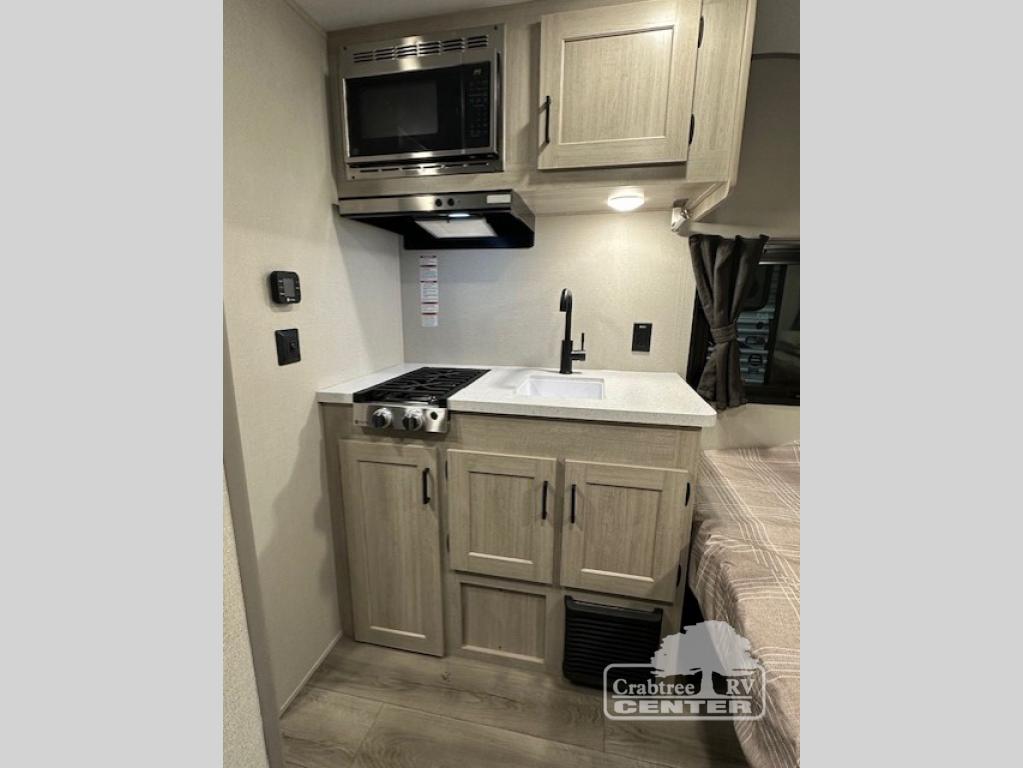 Lightweight camping is easier than you think with this travel trailer in tow! The front 54" x 74" queen bed will provide a great night's rest each night, while the little ones or your guests take the bunk beds. There is a handy shelf above the front bed for your belongings plus additional bedroom storage. A private bath includes a 24" x 32" shower and a toilet with a mirror behind it so you can freshen up each day. You'll also find a two burner cooktop and microwave oven to make meals each day plus a 3.3 cu. ft. 12V refrigerator for food storage!