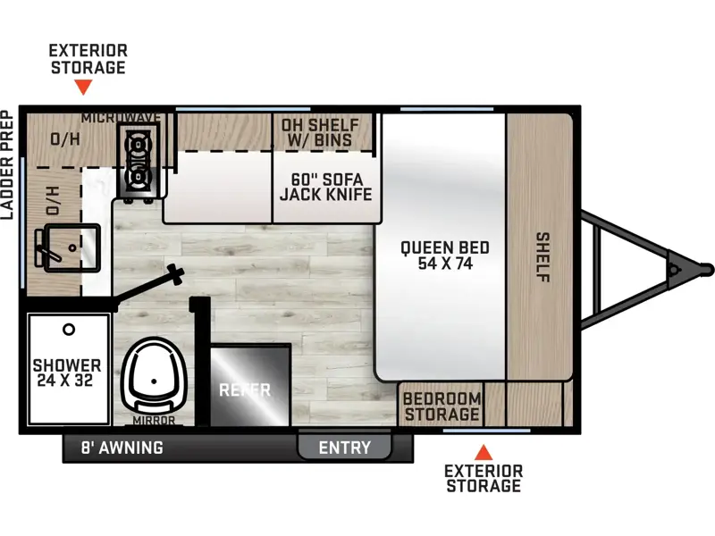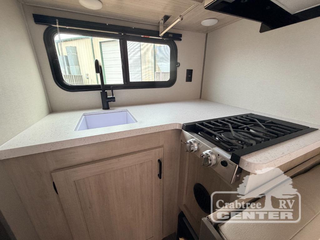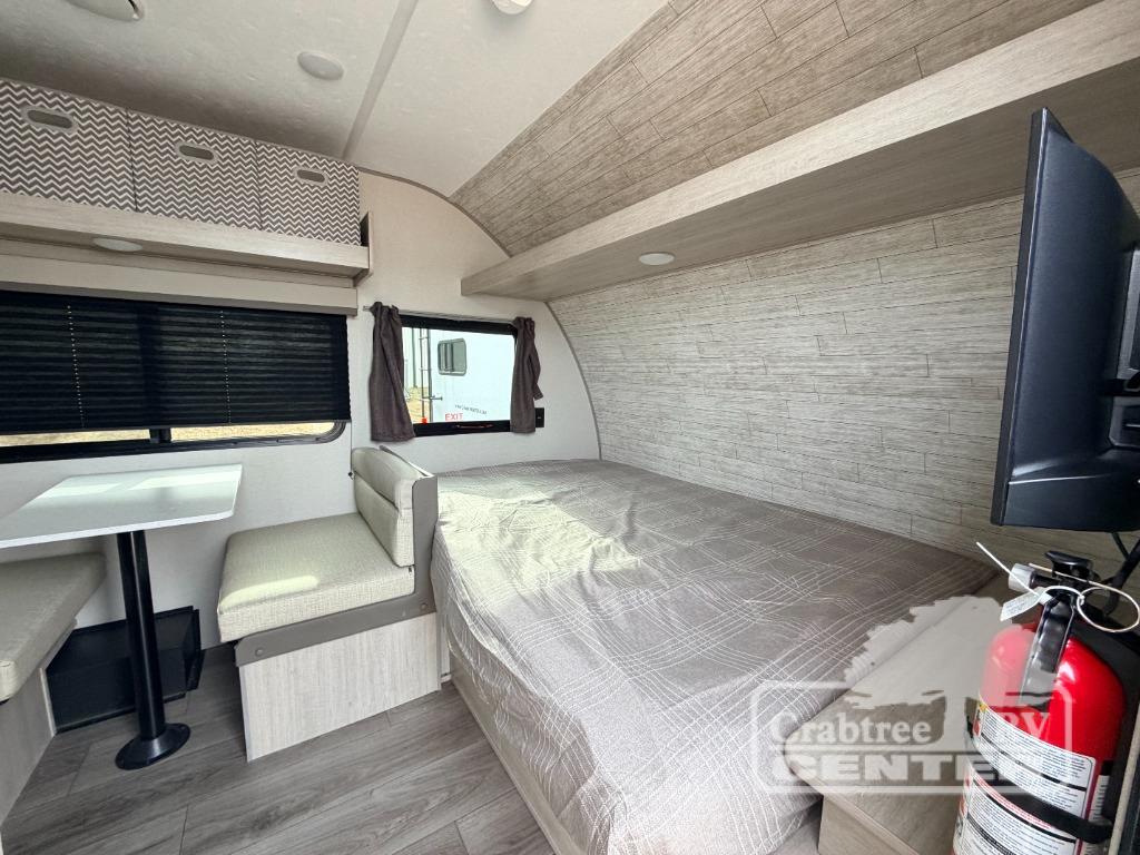 Lightweight camping is easier than you think with this travel trailer in tow! The front 54" x 74" bed will provide a great night's rest each night, while your overnight guest takes the booth dinette. There is a handy shelf above the front bed for your belongings plus additional bedroom storage. A private bath includes a 24" x 32" shower and a toilet with a mirror behind it so you can freshen up each day. You'll also find a two burner cooktop and microwave oven to make meals each day plus a 3.3 cu. ft. 12V refrigerator for food storage!