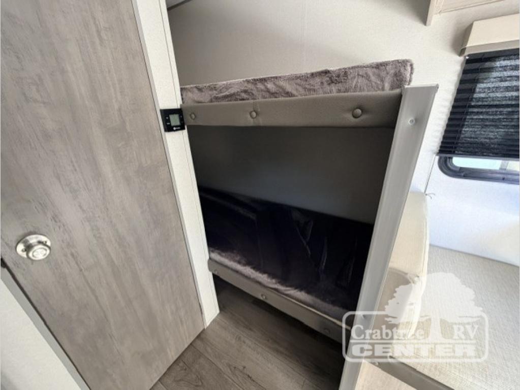 This travel trailers is perfect for a young family or smaller group. You can easily sleep four or more with the rear set of bunk beds and queen bed up front. There is also a 60" sofa for inside down-time, as well as complete kitchen and bath amenities so you can cook and stay clean while traveling. The rear corner bath features a toilet and 36" x 30" shower, and it's conveniently located next to the bunk beds which is great for little ones at night. Cooking inside will be easy with a GE stainless two-burner cooktop and single sink, plus there is also a GE microwave oven for snacks and things that you can easily warm up. If you plan to spend most of your time outdoors, you will find plenty of storage space in the front exterior storage compartment, and there is also plenty of storage inside as well.