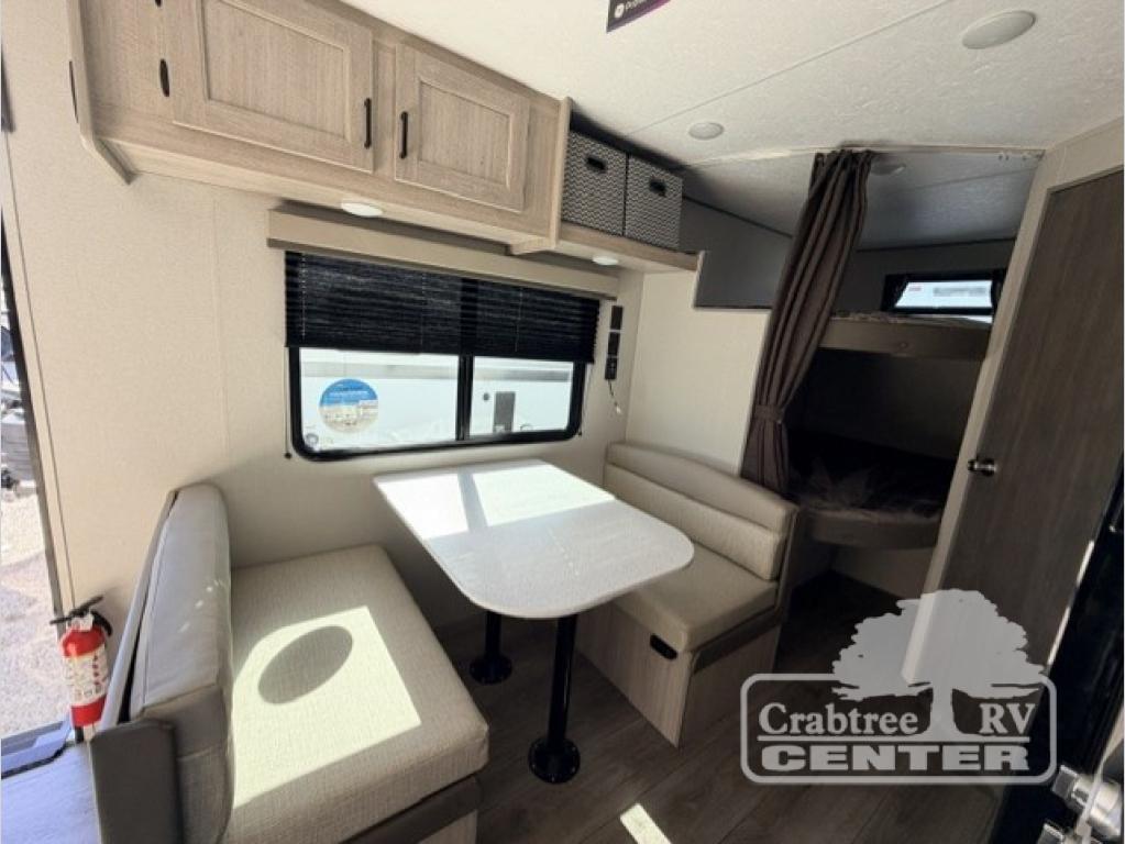 You get to choose to sit at the sofa or at the booth dinette when you are relaxing inside. There is a shelf with storage totes above the sofa for your belongings, and an additional overhead cabinet above the dinette for games. Maybe you want to rest on your own queen bed in the front semi-private bedroom before you make a meal in the kitchen or take a hike through the trails around the lake. The 15' electric awning with multi-color LED lights and a remote offers an outdoor living area where you can visit with other RVers. The kids will love their own double-size bunks that they can share with a friend or two, and the full bathroom is nearby as an added convenience.