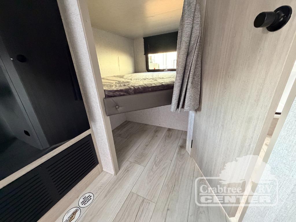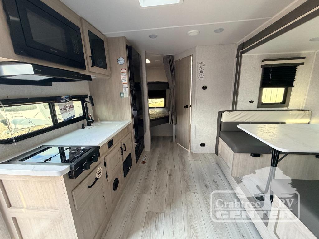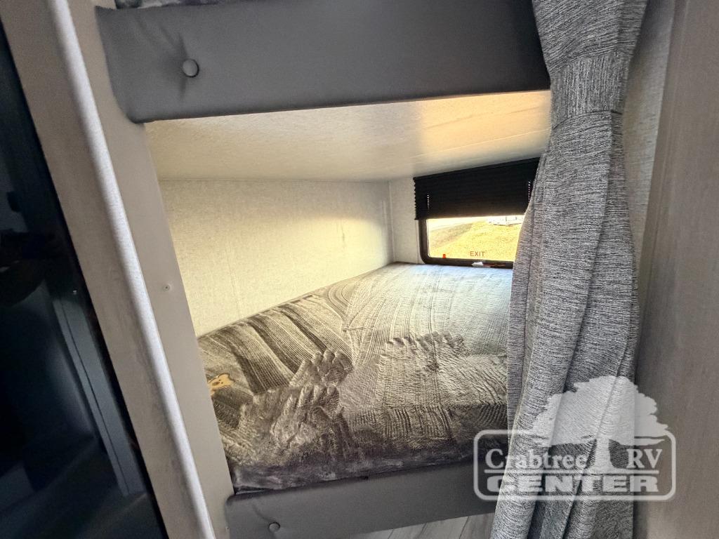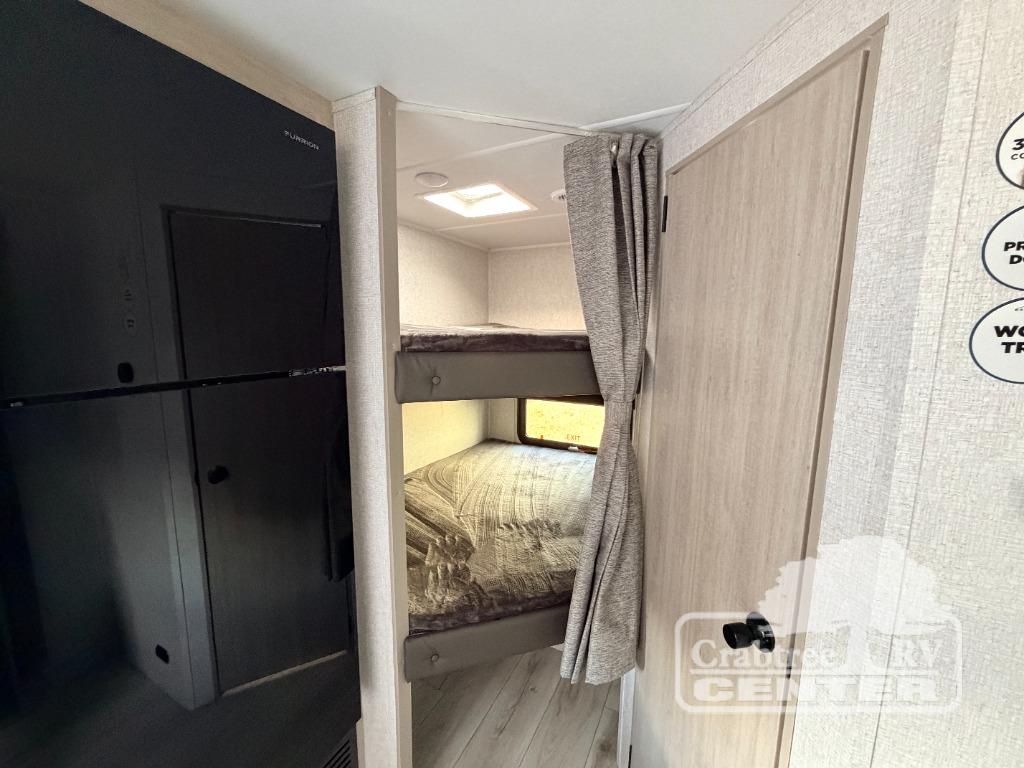 Offering a spacious and functional space for everyone, this travel trailer is perfect for road trips or camping excursions. It features double-sized bunks, providing a cozy sleeping spot for kids and a full bathroom, providing a convenient spot to freshen up after a long day of exploring. The kitchen is equipped with a refrigerator for keeping drinks and snacks fresh, a microwave for quick reheating, and a range with a glass top for preparing meals. Overhead cabinets provide ample storage for cookware and dishes, and the booth dinette provides a comfortable spot for meals and snacks or even an extra sleeping space. More sleeping space is provided by the front bed where you will find a queen-sized bed features a headboard with flip-up storage.