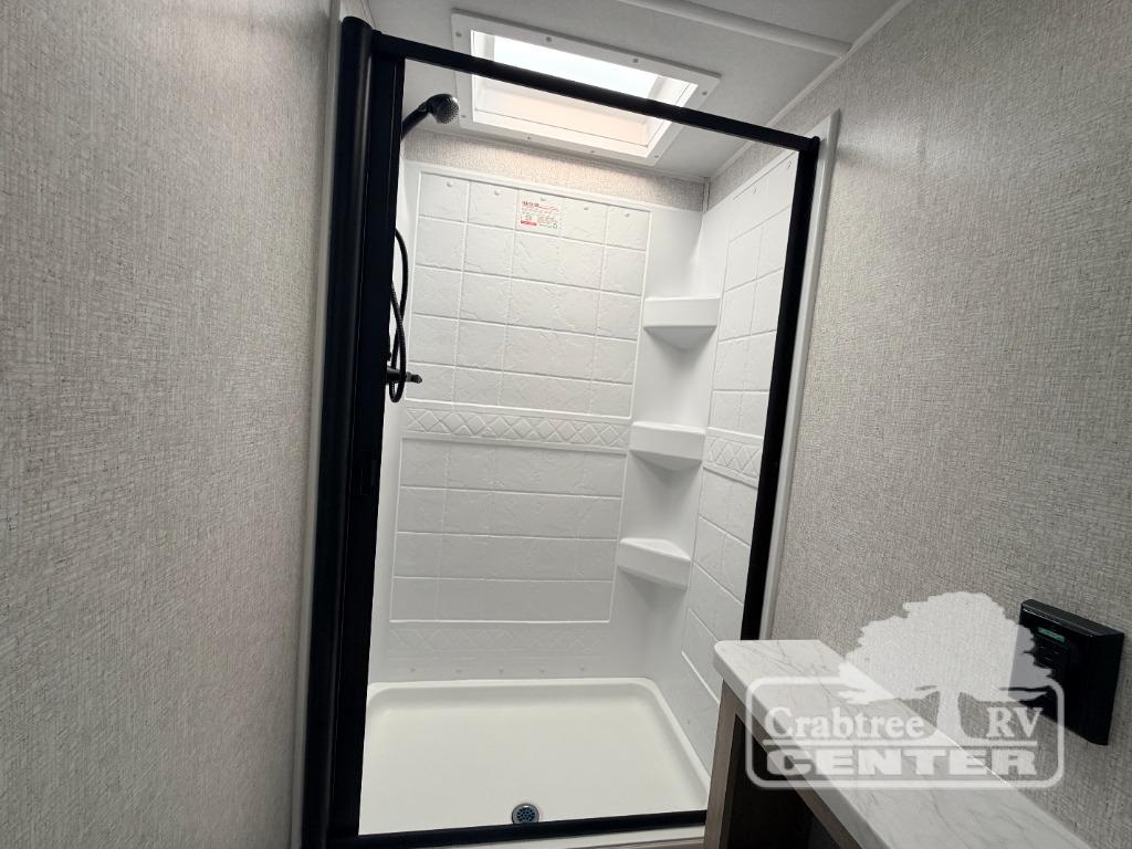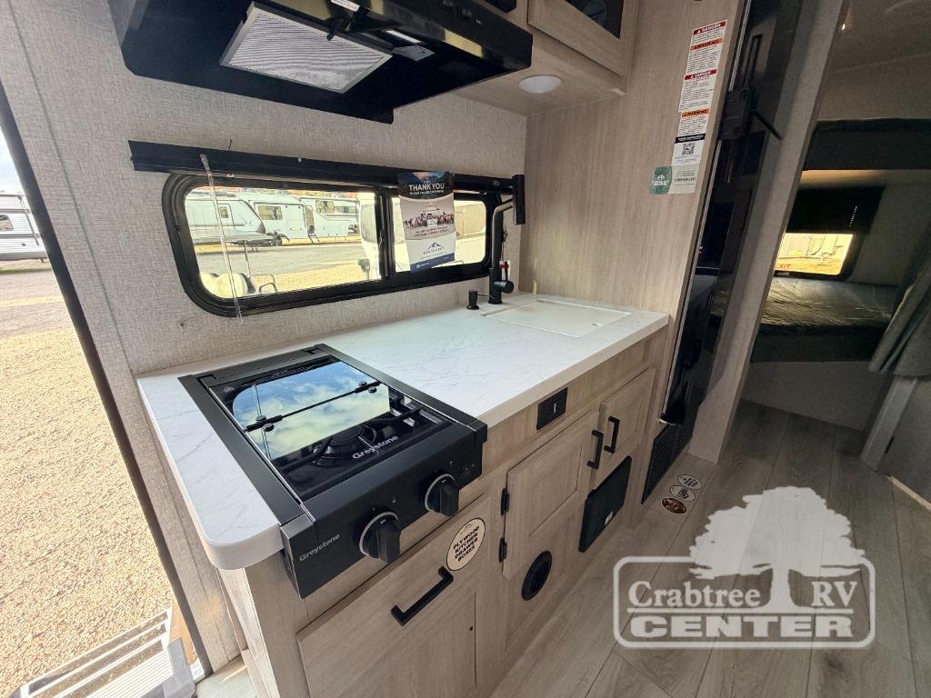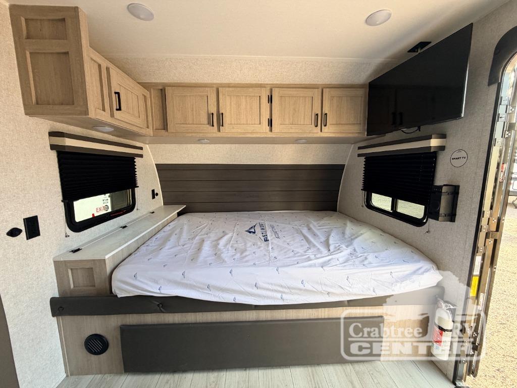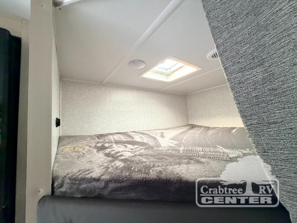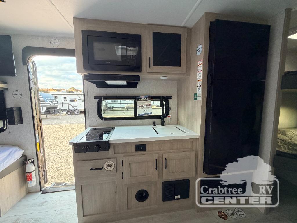 Offering a spacious and functional space for everyone, this travel trailer is perfect for road trips or camping excursions. It features double-sized bunks, providing a cozy sleeping spot for kids and a full bathroom, providing a convenient spot to freshen up after a long day of exploring. The kitchen is equipped with a refrigerator for keeping drinks and snacks fresh, a microwave for quick reheating, and a range with a glass top for preparing meals. Overhead cabinets provide ample storage for cookware and dishes, and the booth dinette provides a comfortable spot for meals and snacks or even an extra sleeping space. More sleeping space is provided by the front bed where you will find a queen-sized bed features a headboard with flip-up storage.