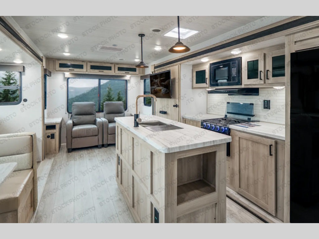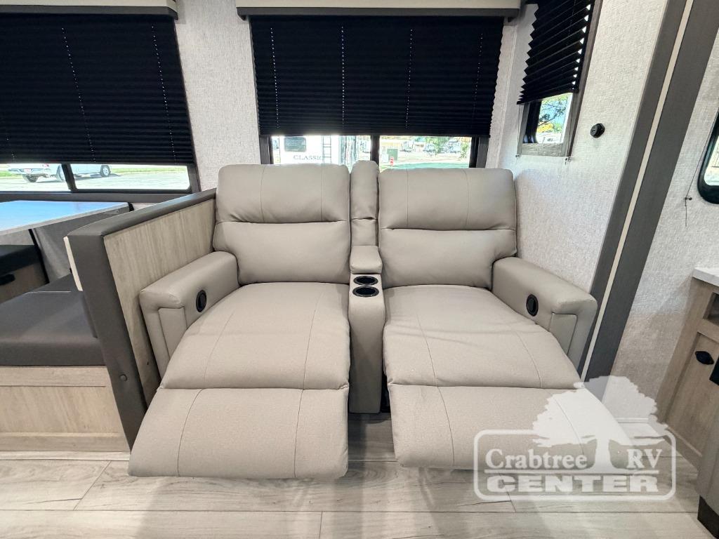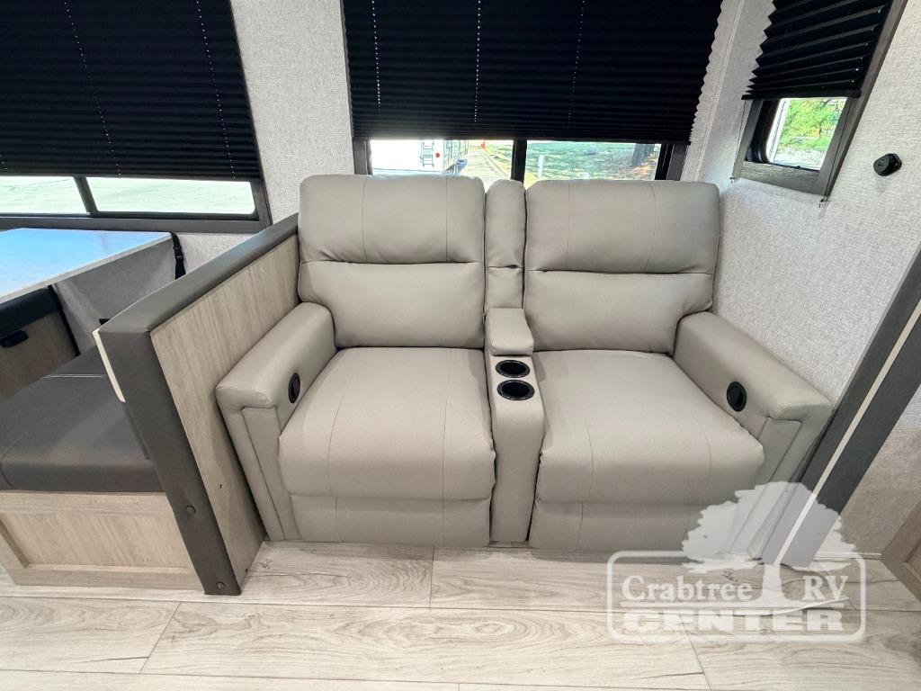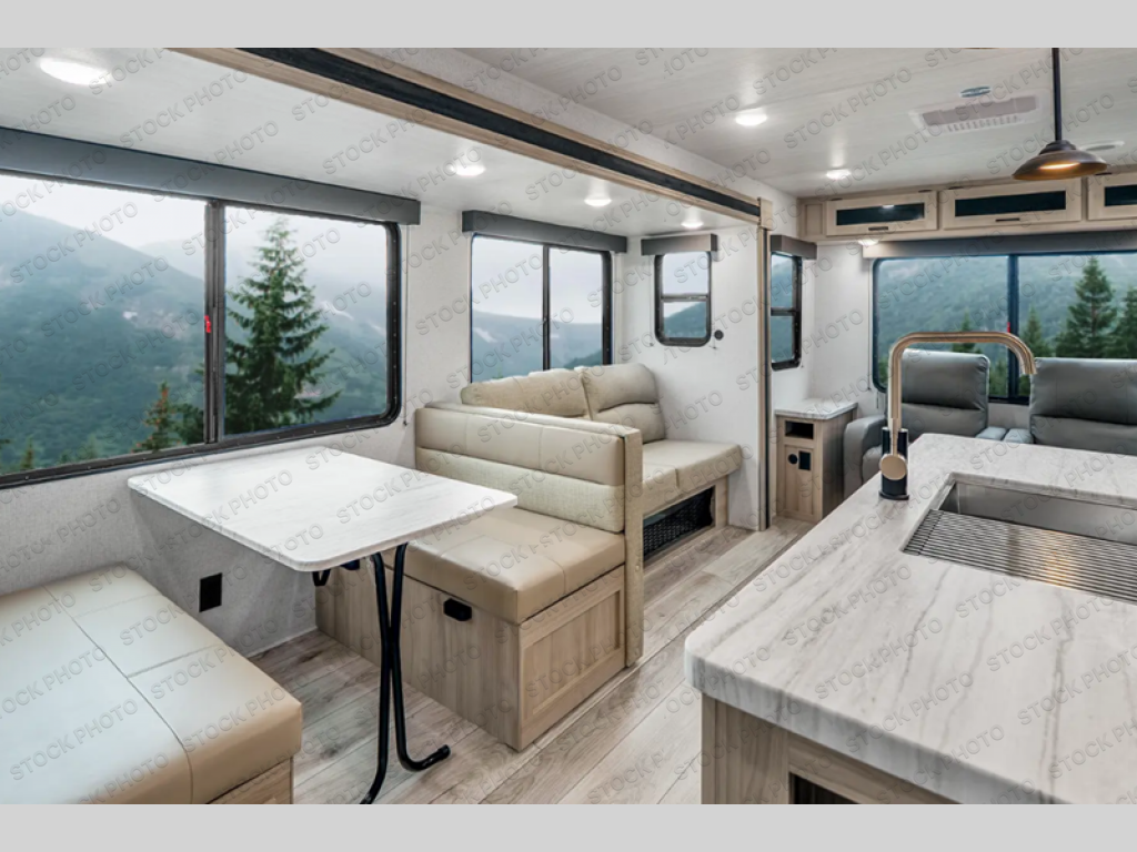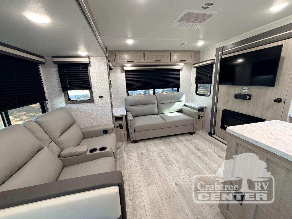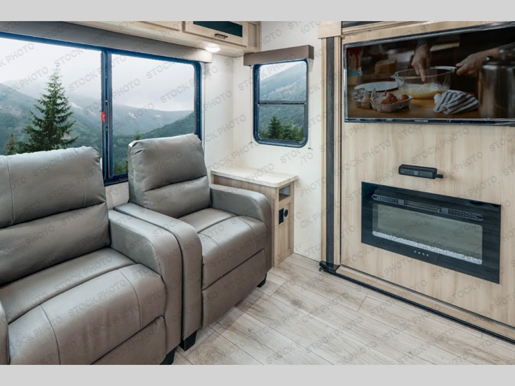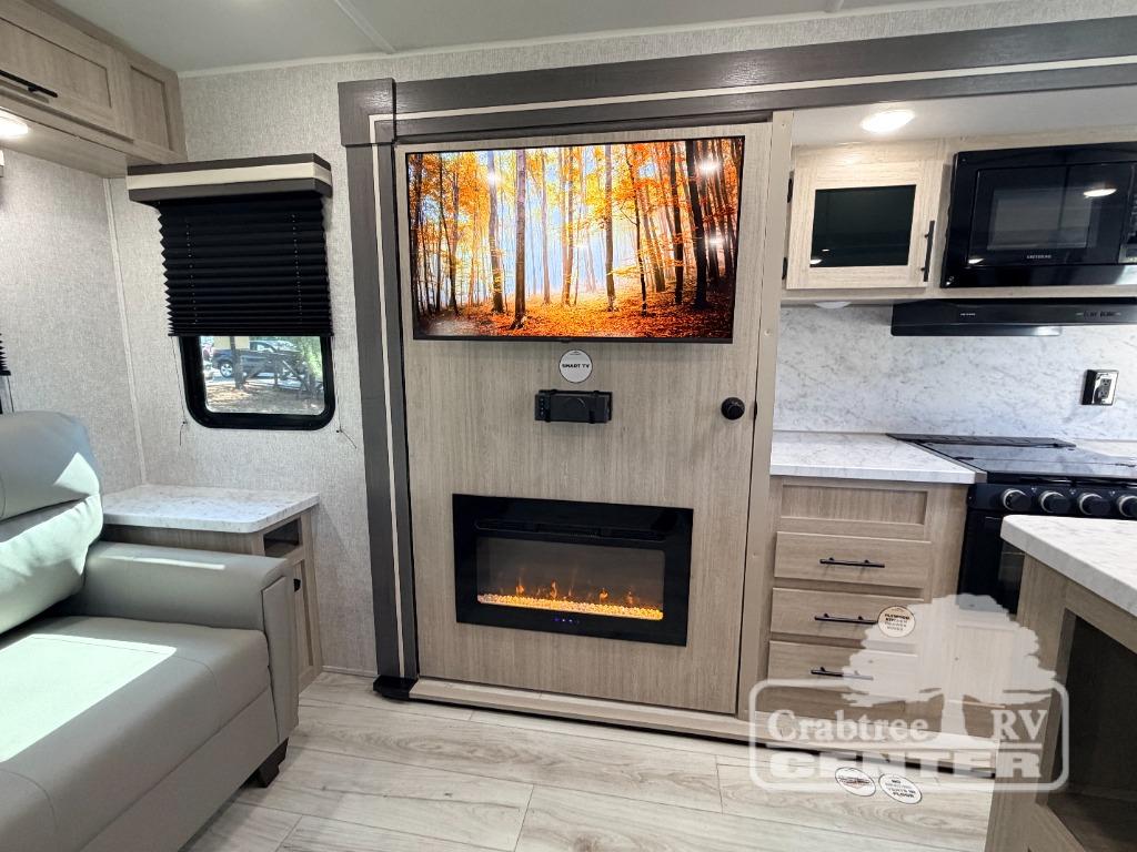 Camping in this double slide out travel trailer will be easier than ever! Once you arrive at your destination, set up the power awning, unload the pass-through storage, and head inside to make lunch in the full kitchen. There is a kitchen island for more prep space, along with a 10.7 cu. ft. 12V refrigerator, three burner range, and microwave oven. You'll find comfortable seating space on the booth dinette, jiffy sofa, and dual lounge chairs, and the fireplace is sure to make your space feel more like home. There is also hidden storage behind the fireplace for pantry items, board games, and more! Up front, a full bath and front private bedroom will let you freshen up before a great night's rest on the king bed!