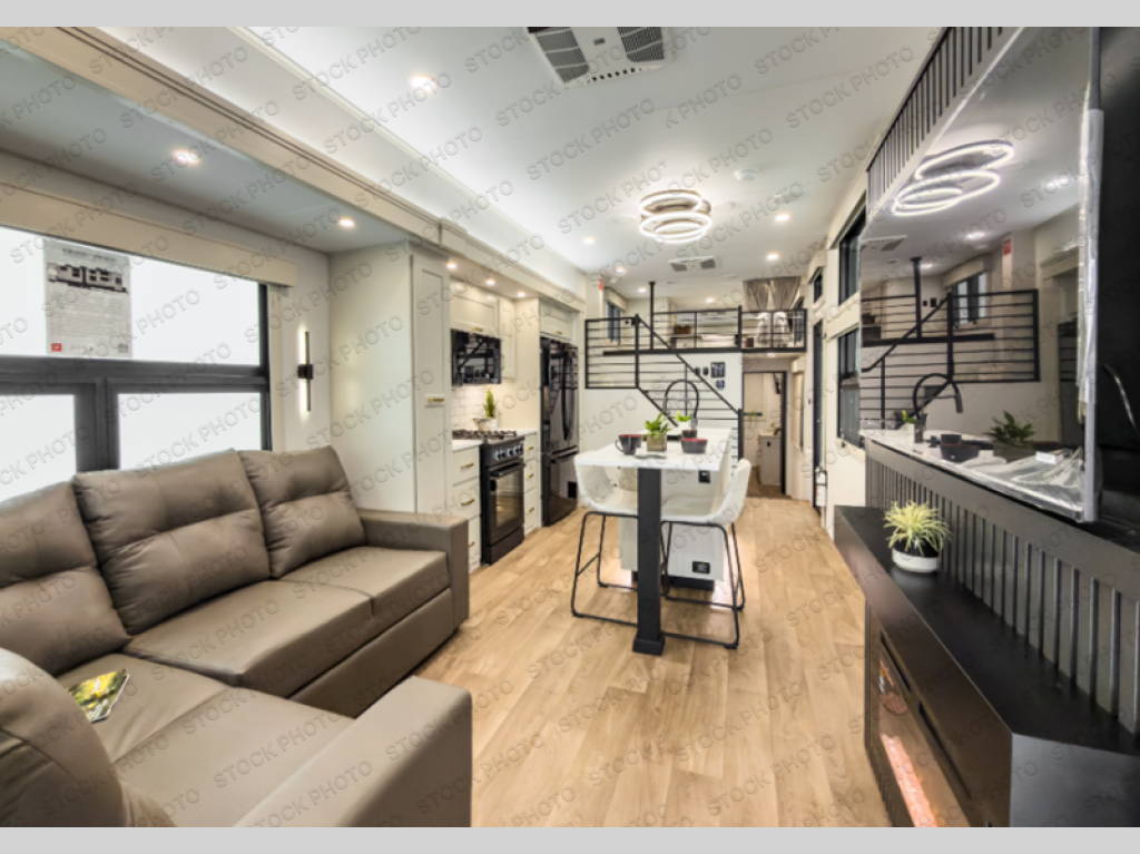 You'll fall in love with this spacious destination trailer that can sleep six each night! With dual entry doors, you can enter in through the rear deck that includes a lower level for gathering, and an observation deck to take in the stars! The other entry door leads into the combined kitchen and living room that includes a spacious kitchen island with a dishwasher, a pull-out pantry, an 18.6 cu. ft. refrigerator and an L-shaped sofa with a trundle bed. There is also an entertainment wall with smart storage and sliding doors that go out to the rear deck. A set of stairs leads to the loft with a queen-size sleeping pad, ample storage space, plus a table with a foot nook so you can put the table away when not in use. Back downstairs, a full bath will let you freshen up each day and a front private bedroom with a king bed slide is sure to bring comfort. There is also storage space for your things, a telescoping TV, plus washer and dryer prep if you plan to add these appliances!
