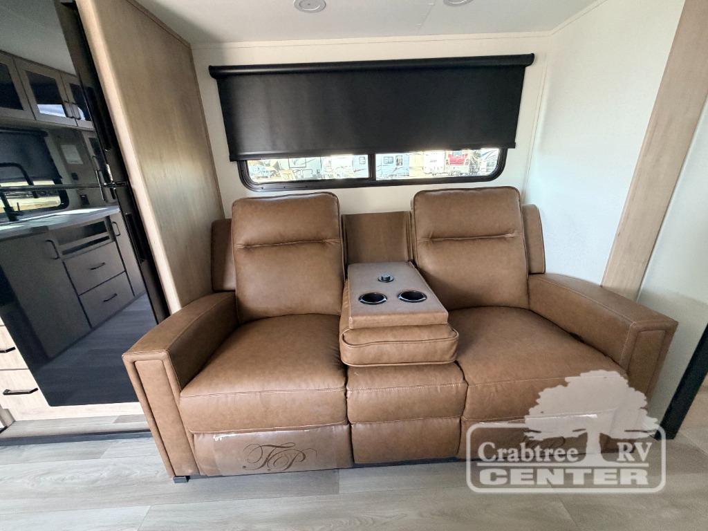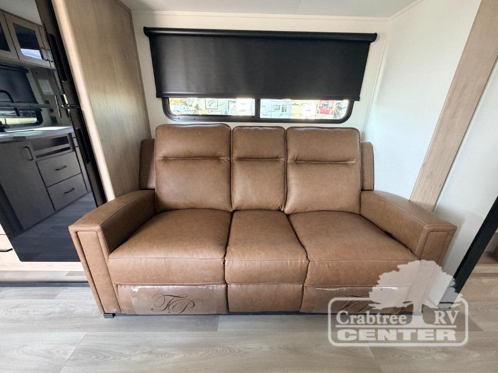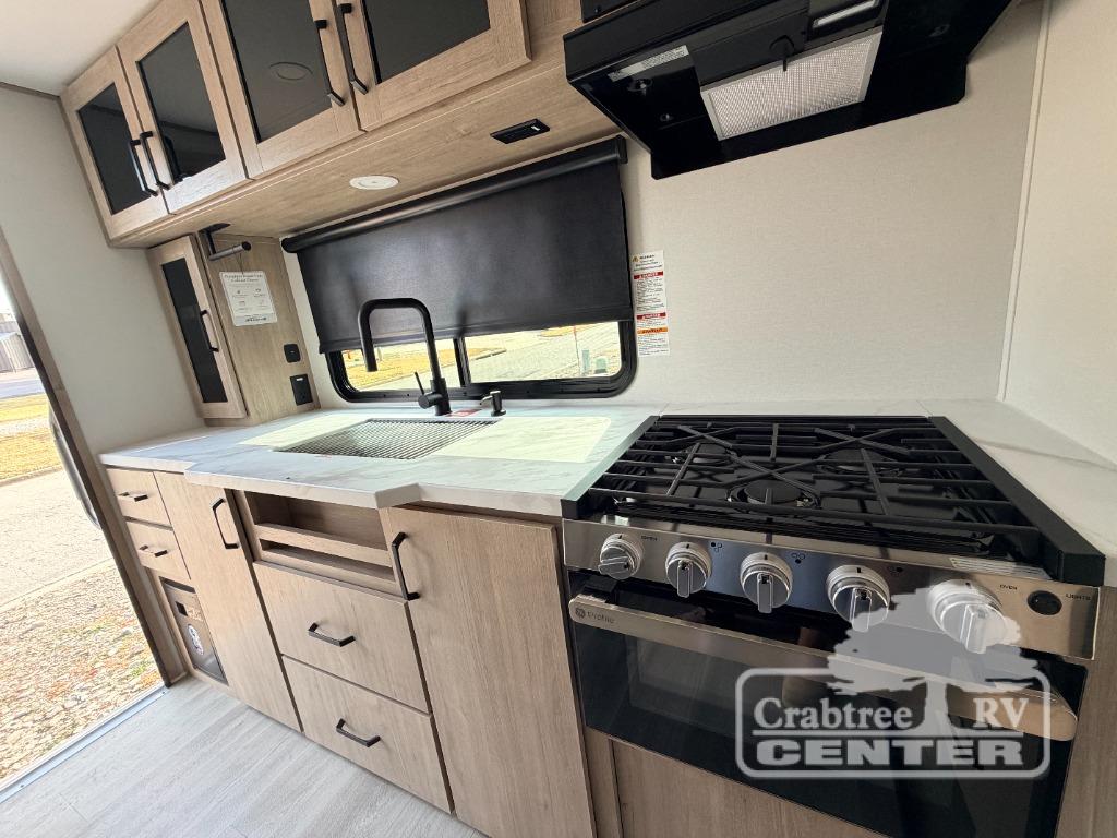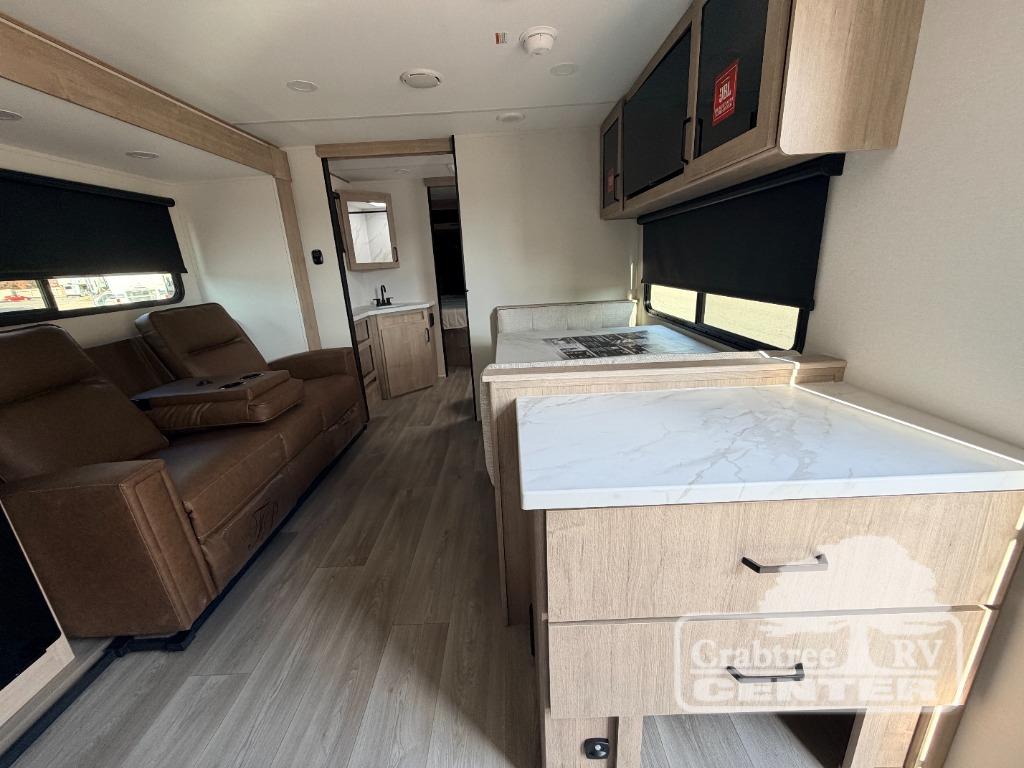 Treat yourself to a weekend of fun in this Imagine XLS travel trailer! Whether it's just you and your spouse, or you've chosen to bring along a group of friends, this trailer will meet your needs. The front bedroom can sleep two people on the walk-around queen-size bed. The bedroom is quite functional because it not only contains the second exterior entry door, but it also has a private entrance into the walk-through bathroom since it is located on the other side of the bathroom. The booth dinette is functional too because it can transform from a dining location into a sleeping location, and the theater seating is directly across from the LED TV for easy viewing. The rear kitchen is fit for the chef on the trip, it features residential countertops, a stainless-steel sink and a 3-burner range with oven for you to cook your meals in comfort.