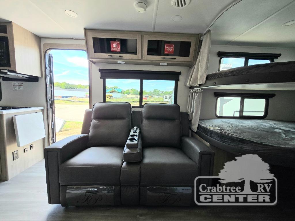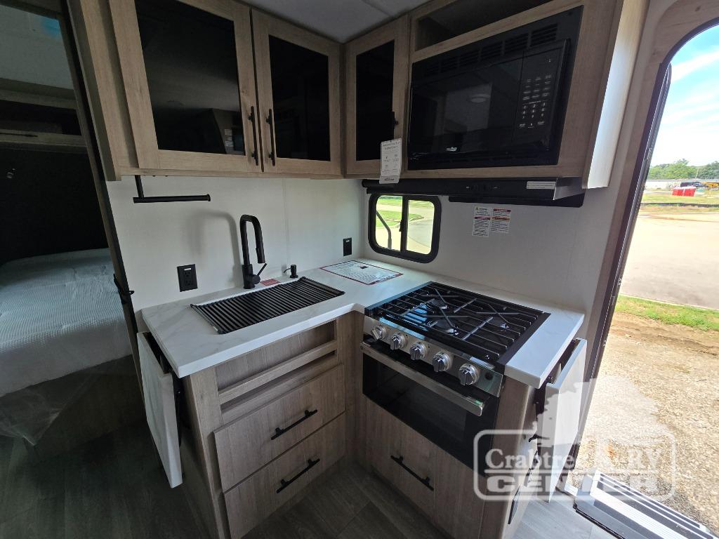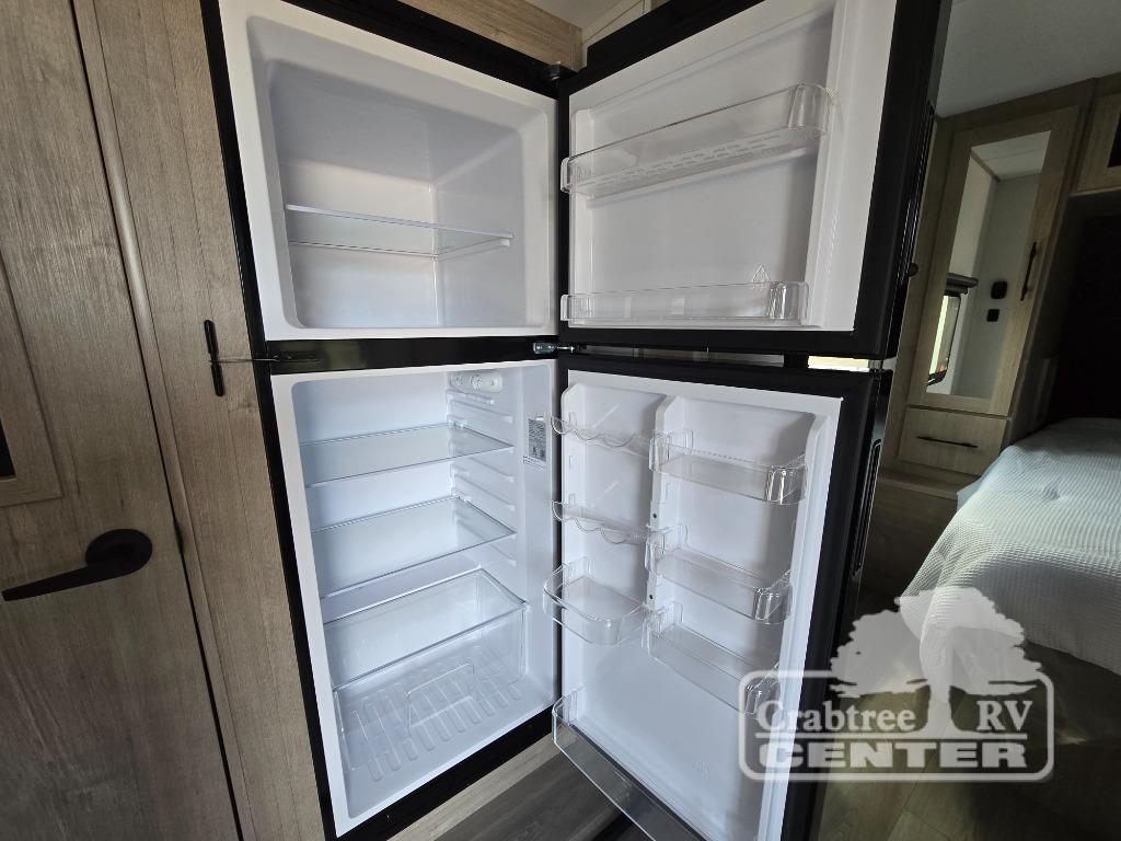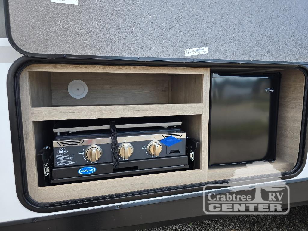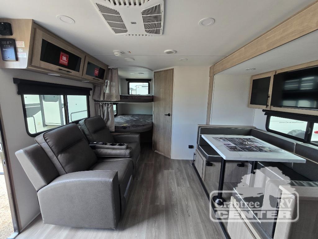 The dual entry doors make it easy to enter and exit this travel trailer! You will find a walk-around queen-size bed up front in the private bedroom, and one of the entry/exit doors to the unit so you can quietly slip out for an early morning fishing trip. The U-shaped dinette is right next to the window, so you can look out at your surroundings while you enjoy breakfast. The double-size bunks have some privacy curtains, and the bunks are right next to the full bathroom for easy access in the middle of the night. The fully equipped kitchen has everything you need to get dinner in the oven, and you can have some more prep space by using the flip-up countertop extension. You even have an outdoor griddle and an outdoor 1.6 cu. ft. refrigerator to enjoy a cold beverage while you cook under the 22' electric awning!
