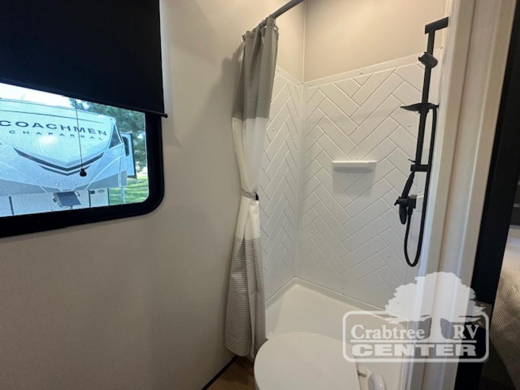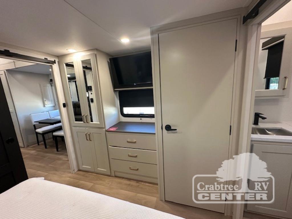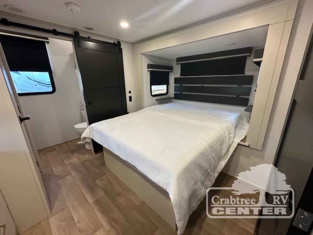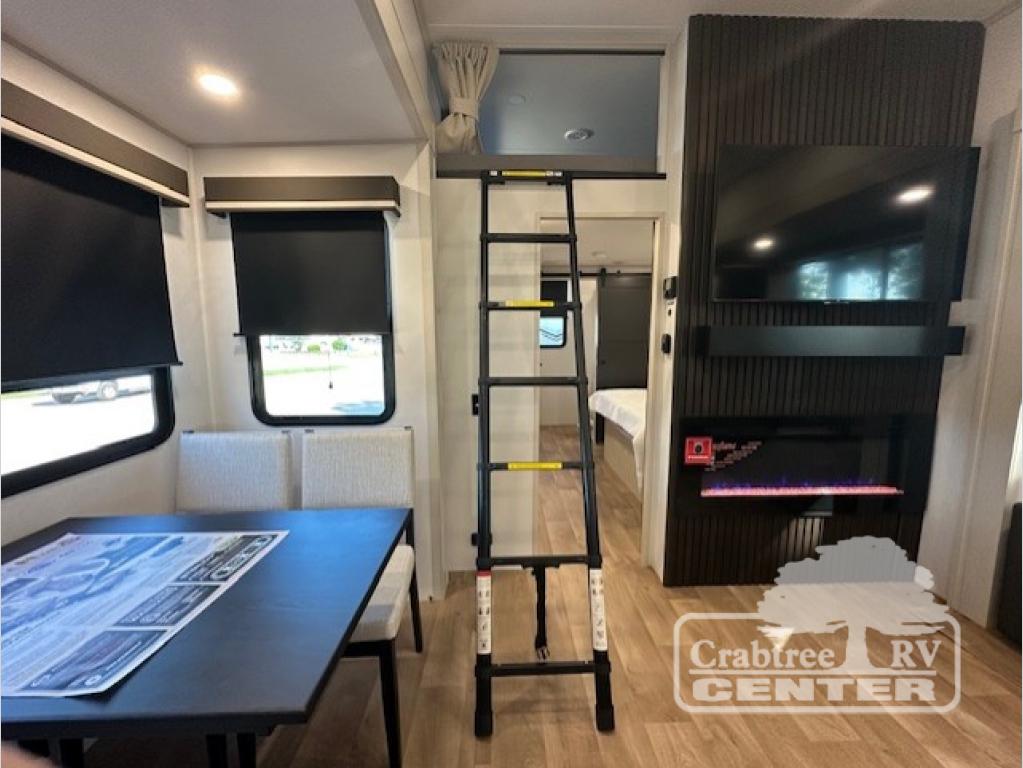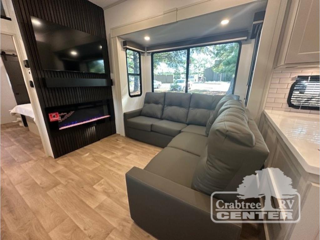 Grab the whole gang and head out in this fifth wheel featuring two private bedrooms, two full baths, and quad slides for even more space in this widebody layout. The living area featuring dual opposing slides offers space to dine and relax including an L-shaped sofa with recliners opposite the entertainment center and fireplace. You'll also love the full kitchen with ample counter space, a spice rack above the microwave, a pull-out pet dish, and more convenient features. The front master bedroom includes a queen bed with an optional king bed, a private entrance into the dual entry bath, plus a slide out with the wardrobe and bath sink. And your guests can take the second master bedroom with a folding queen bed slide, washer and dryer prep, a full rear bath, and even a loft above for more sleeping space!