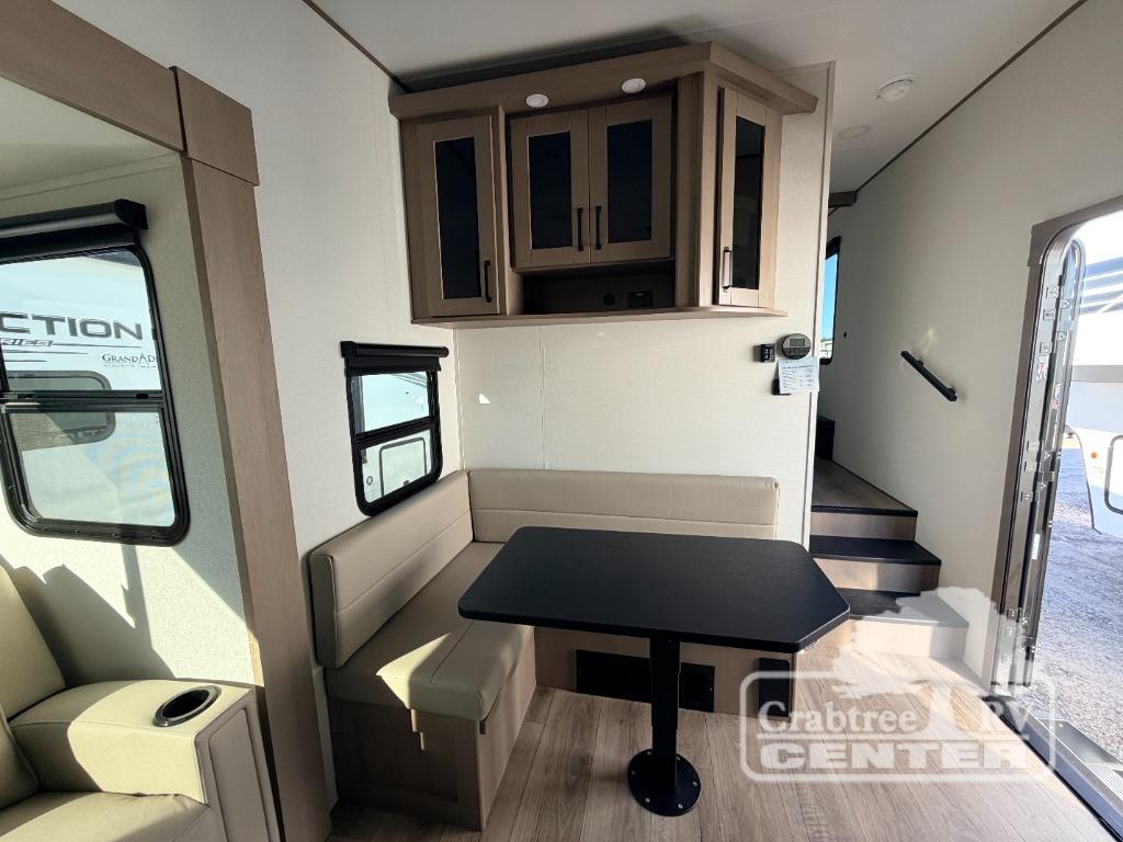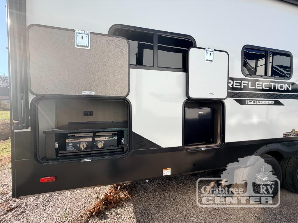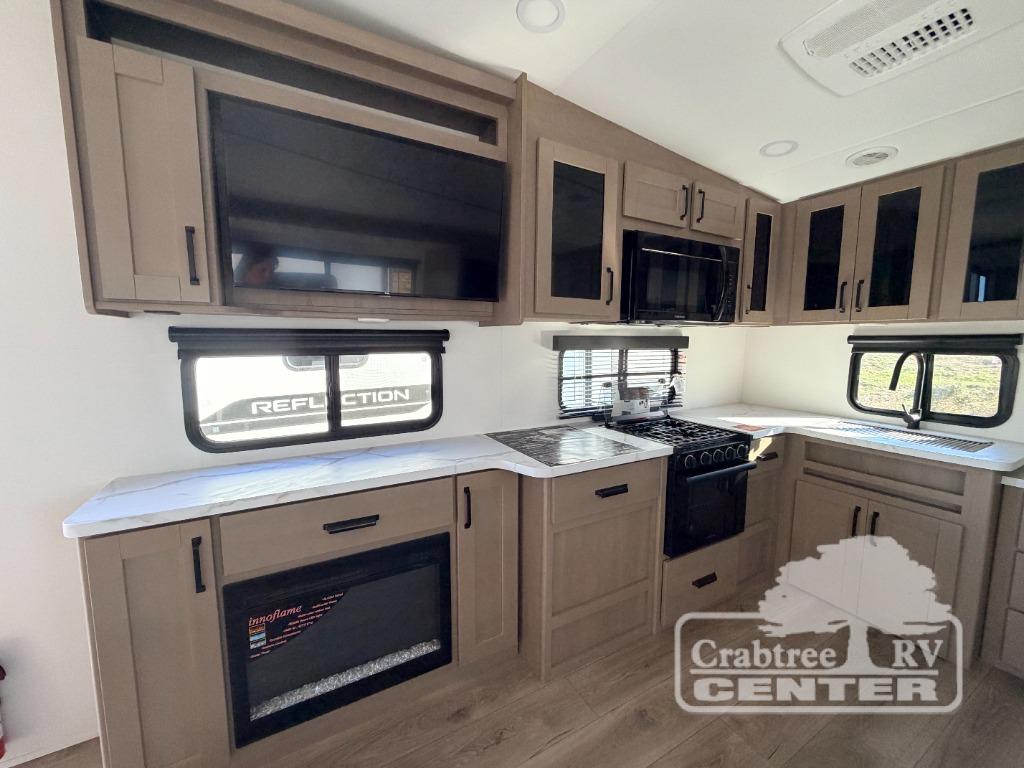 With any Reflection 150 Series fifth wheel by Grand Design, there is more available payload capacity and a broader range of half-ton trucks capable of towing this fifth wheel, and no slider hitch is needed thanks to the 90-degree turning radius which makes them short bed friendly and easier to tow. The mandatory Ultimate Power package provides a "One-Touch" automatic leveling system and a detachable power cord with LED light for easy setup, plus motion sensor pass-through lighting and entry lighting, and the Tire Linc TPMS will help you stay safe on the road. The interior offers residential luxury from the cabinetry and premium Congoleum flooring, to the booth dinette and residential-style window treatment. Make your refined decision today!