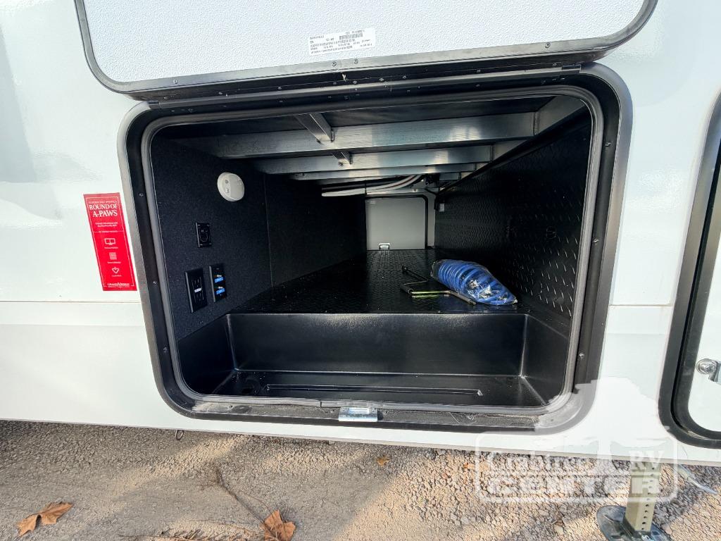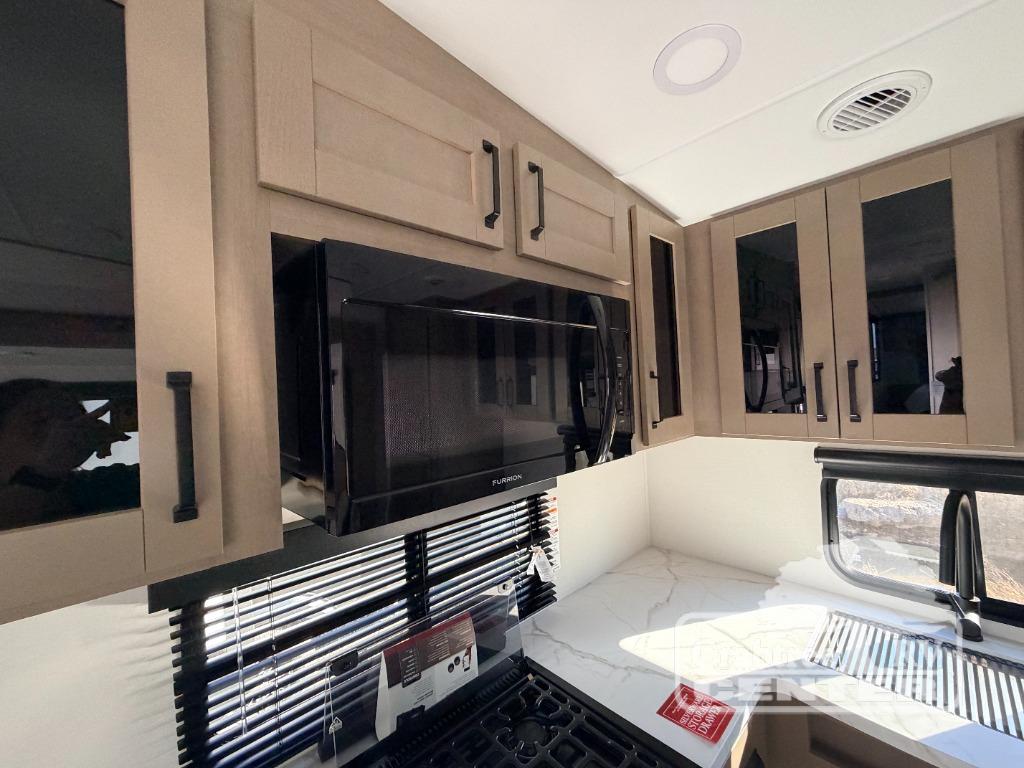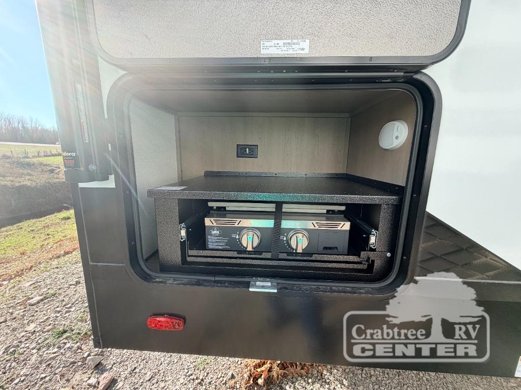 You will love this fifth wheel featuring a single slide for added interior living space and all the comforts and conveniences it provides you while you travel. The slide features a 78" theater seat plus there is a breakfast nook for more seating. Both can easily view the entertainment center with 40" TV. A rear kitchen indoors provides everything you need to create meals like home while on the road, and if you want to spend as much time outside as possible, then the outdoor griddle will certainly accommodate you for meals. Up front, a cozy private bedroom with queen bed, wardrobe, and overhead cabinets. Right next door, you will find a large walk-in shower, as well as a toilet, and a vanity with sink and linen cabinet for your towels and toiletries. You will also love the full unobstructed pass-through compartment for all of your gear, plus so much more!