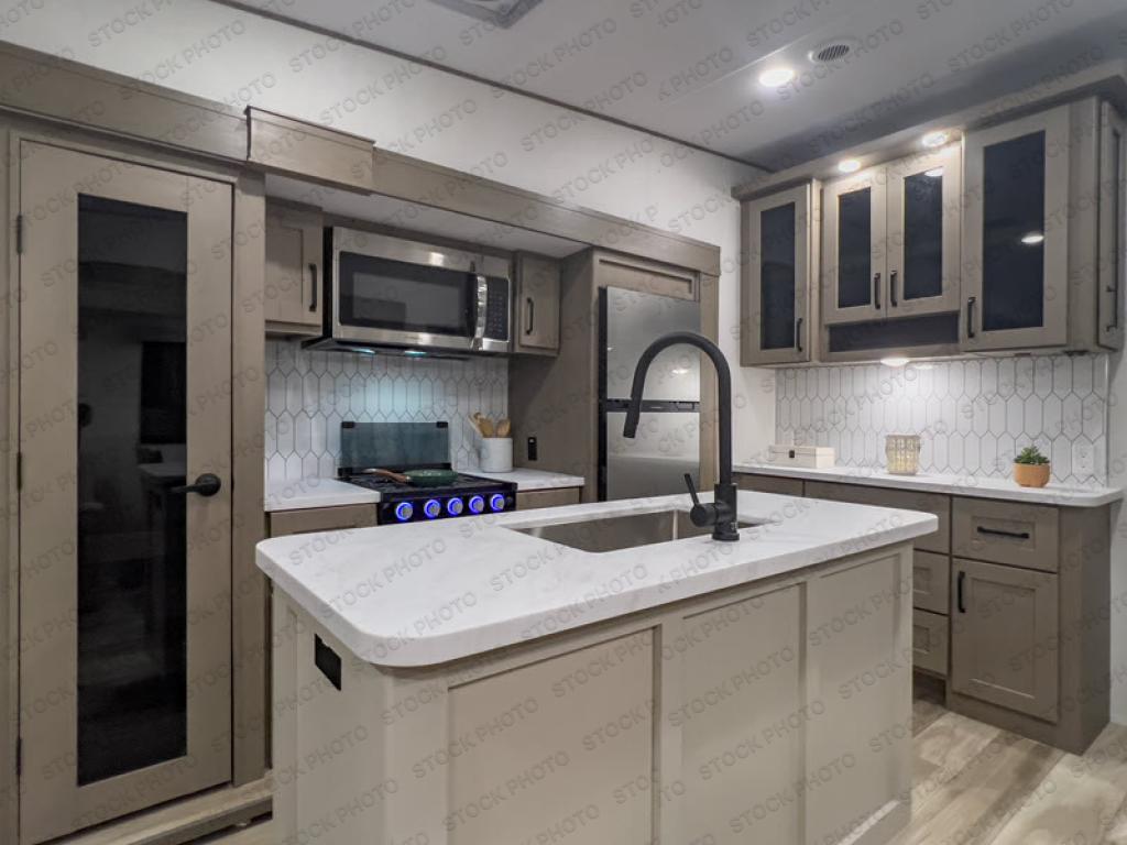 Get ready to enjoy everything the campgrounds and surrounding area has to offer when you are setup to camp in this fifth wheel! The two electric awnings offer protected areas creating outdoor living spaces; just grab your camping chairs from the unobstructed pass-through storage. And the interior offers a spacious living area and kitchen combination with dual opposing slides for maximum space. You can sit on the tri-fold sofa or the dinette to lounge back and rest after a day of adventure. The hutch and kitchen island offer counter space to prepare and serve meals, and there is a large pantry for goodies. The 40" LED HDTV with a fireplace below provides entertainment before bedtime or on a rainy day. And the front bedroom offers privacy, a walk-around queen bed, and plenty of storage!