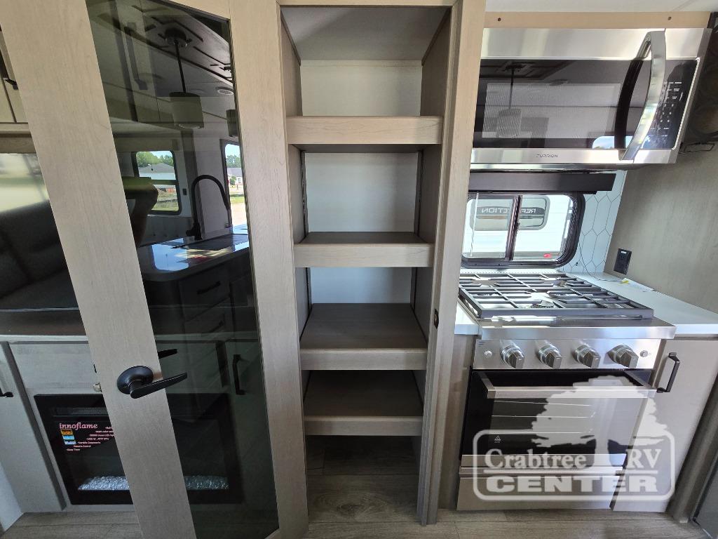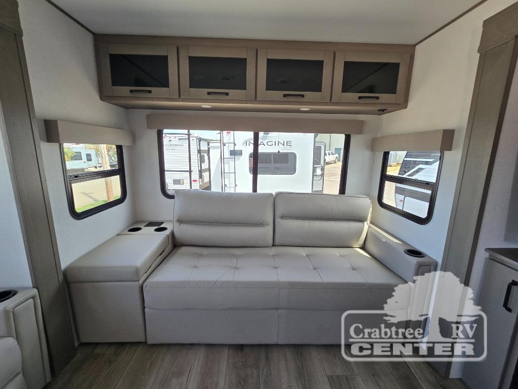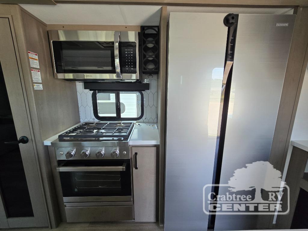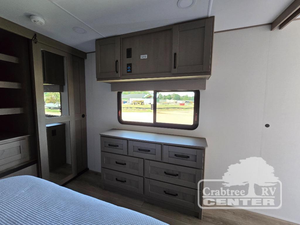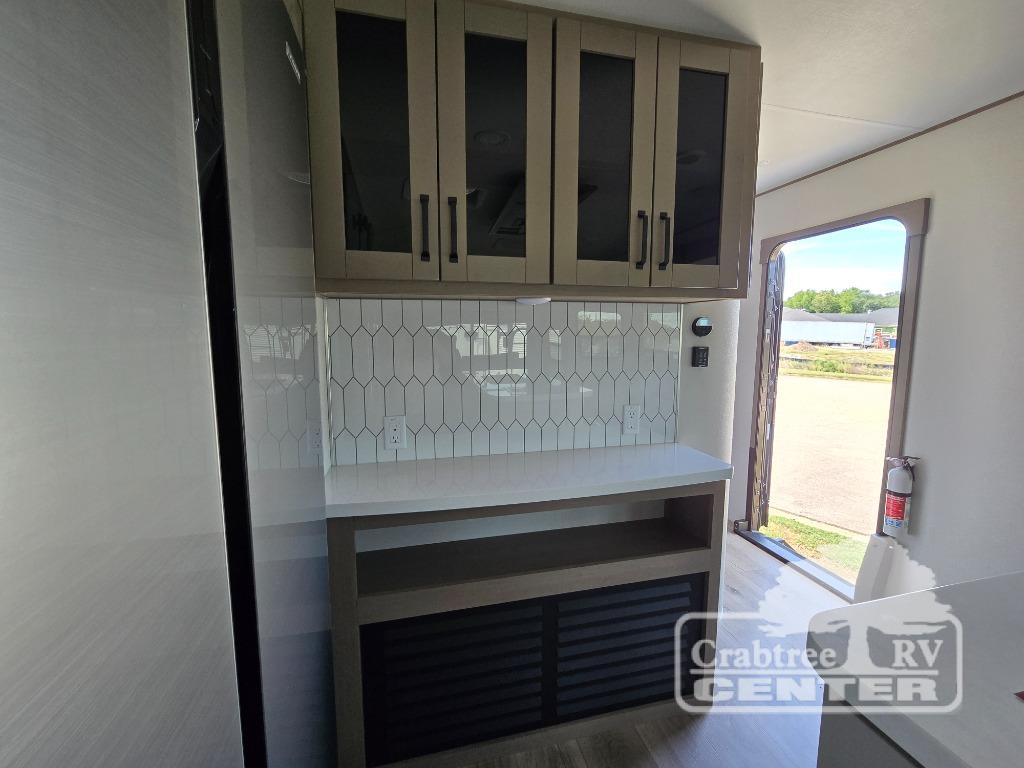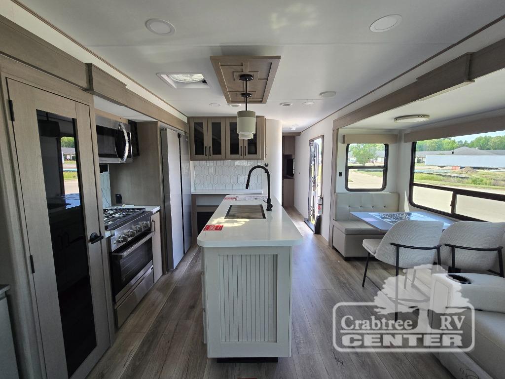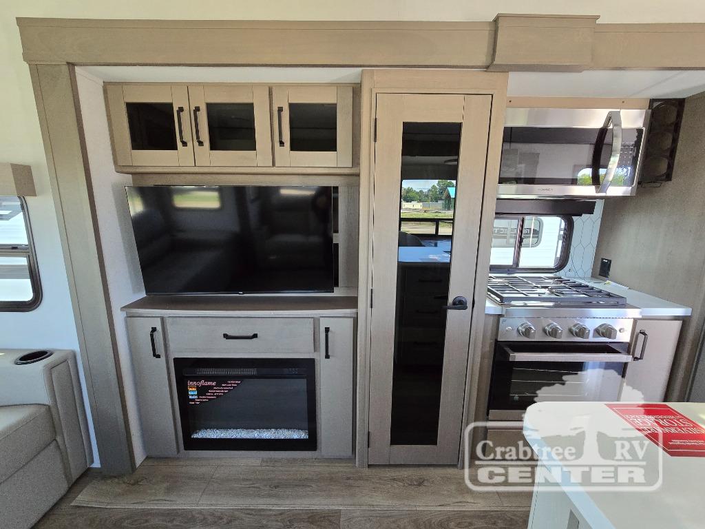 This rear living travel trailer will be perfect for extended stays at the campground or quick weekend trips to the lake! Once you've unloaded your gear from the pass-thru storage, head inside to relax on the rear tri-fold sofa with an adjustable headrest or on the theater seating across from the 40" TV and fireplace. There is also a booth dinette where you can dine together, or you can choose the optional swivel dinette. The spacious kitchen island will make meal time easier than ever, plus there is a pantry and 16 cu. ft. 12V refrigerator for food storage. The full bath is right next to the front private bedroom for easy nighttime use, and speaking of nighttime, you're sure to sleep soundly on the queen bed slide. There is also a large front closet, TV prep, plus washer and dryer prep if you choose to add these appliances.
