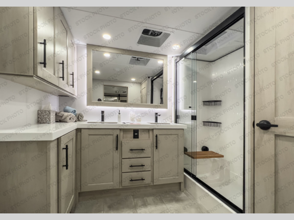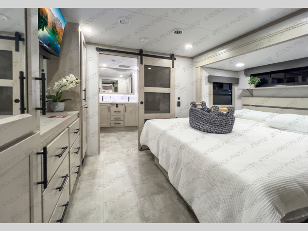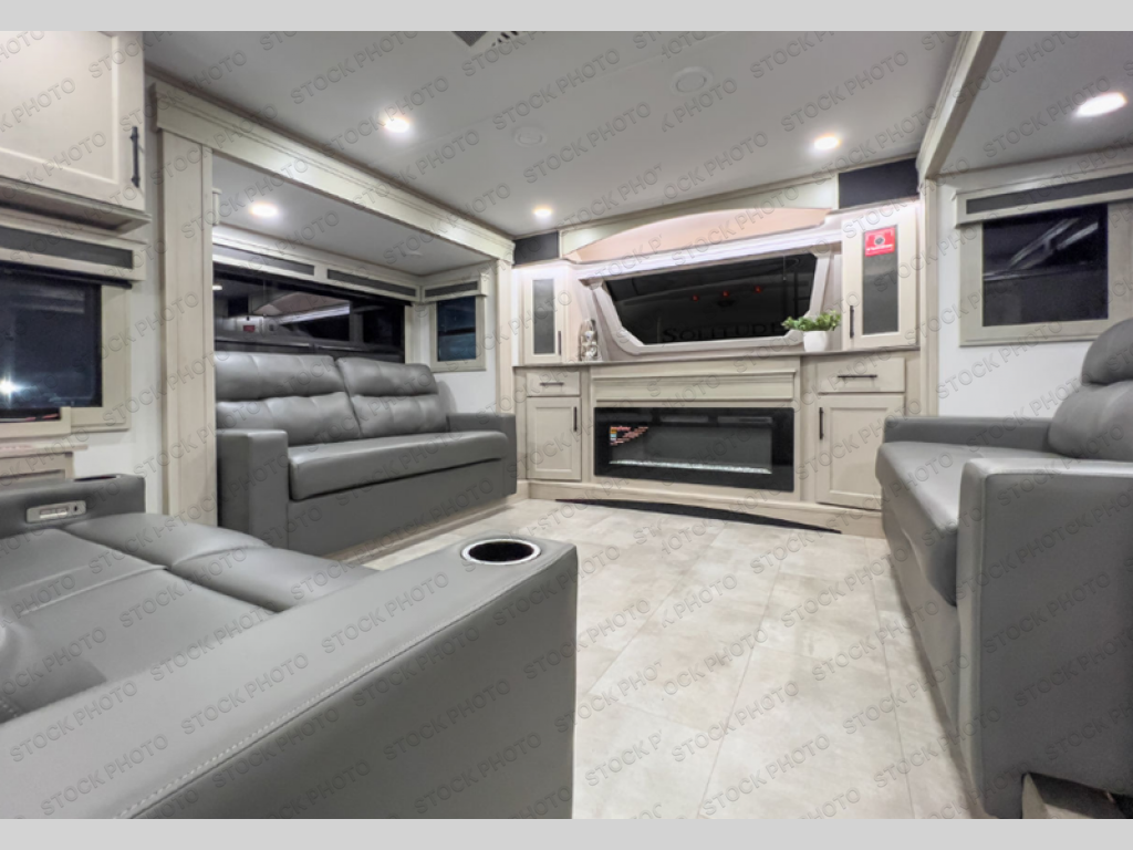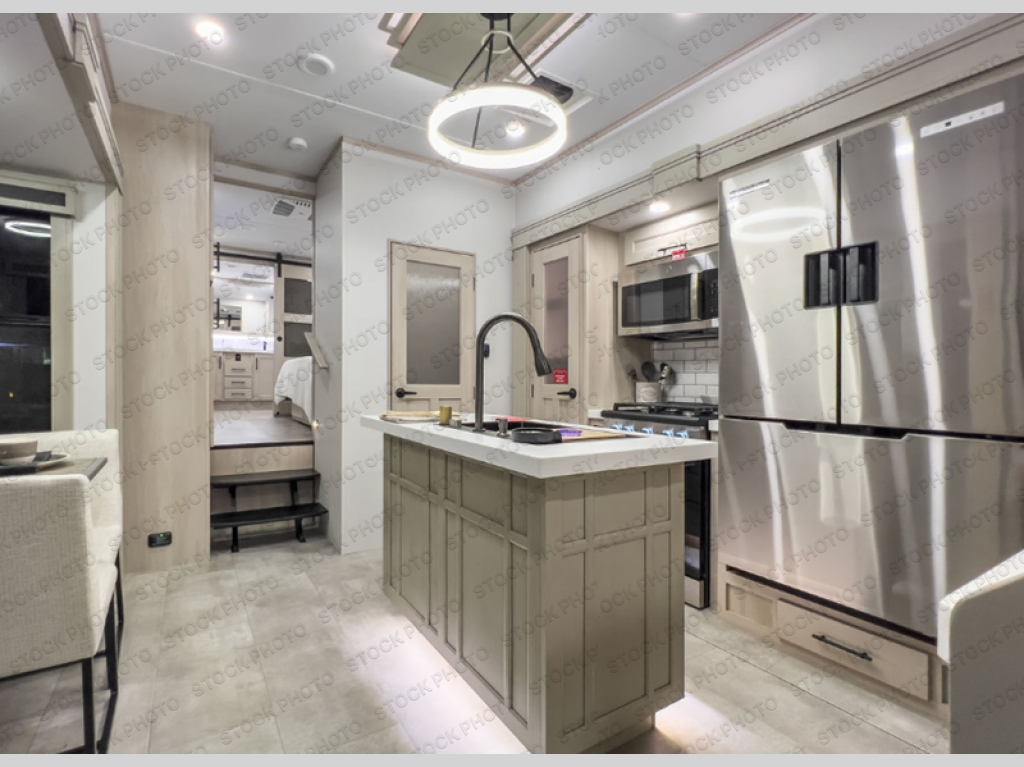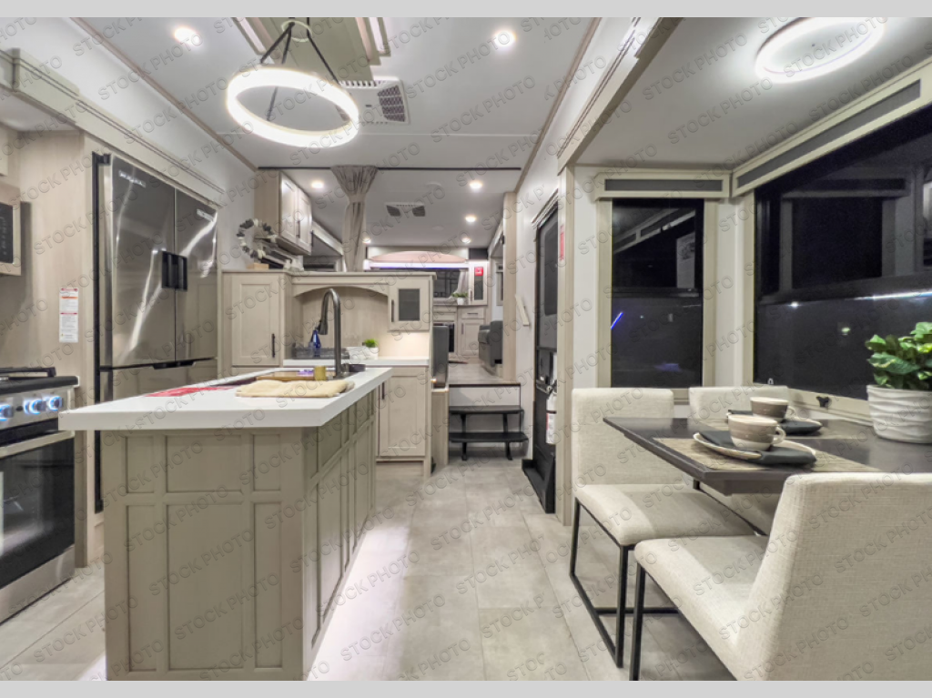 Five slide outs, a full bathroom with dual sinks, a half bath off of the kitchen, and a separate front living room and entertainment area are a few reasons you will enjoy your time spent in this fifth wheel! The separate kitchen is a dream with stainless steel appliances including a built-in oven, a pantry and hutch with counter space, a kitchen island plus a free-standing dinette slide with windows for great views. The entertainment center offers an LED Smart TV with a fireplace below and storage, and the dual opposing tri-fold sofas provide added sleeping space at night. The master bedroom includes a queen bed plus space savings sliding doors that lead you to the rear full bathroom with dual sinks, linen storage, and washer/dryer prep. The exterior has several storage choices as well including a pass-through compartment for fishing poles and such, plus the unique sliding tray in the rear allows you to bring along larger items such as camping tables, portable grills, golf clubs, totes and more.