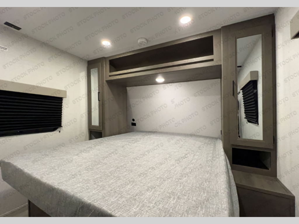 This is the perfect travel trailer if you like to camp with friends and family. Since there are double-size bunks, a queen bed in the front bedroom, plus a booth dinette and sofa, you can sleep eight campers each night! The three burner range and microwave in the kitchen will let you cook meals each day, and the 12V refrigerator will keep your cold items fresh. This model also includes a counter with extra storage underneath, a pull-out trash can storage for convenience, and a full bath to freshen up in each day. And you'll love having your own space in the front bedroom with a privacy curtain, dual wardrobes, and TV prep if you want to add a television!