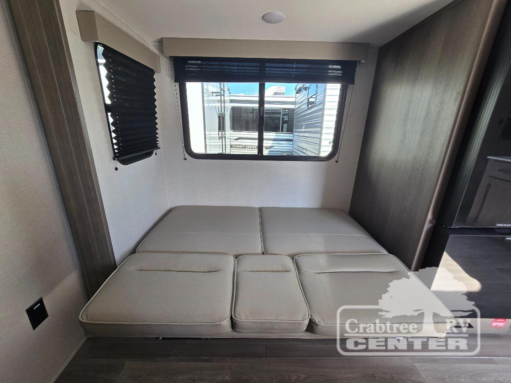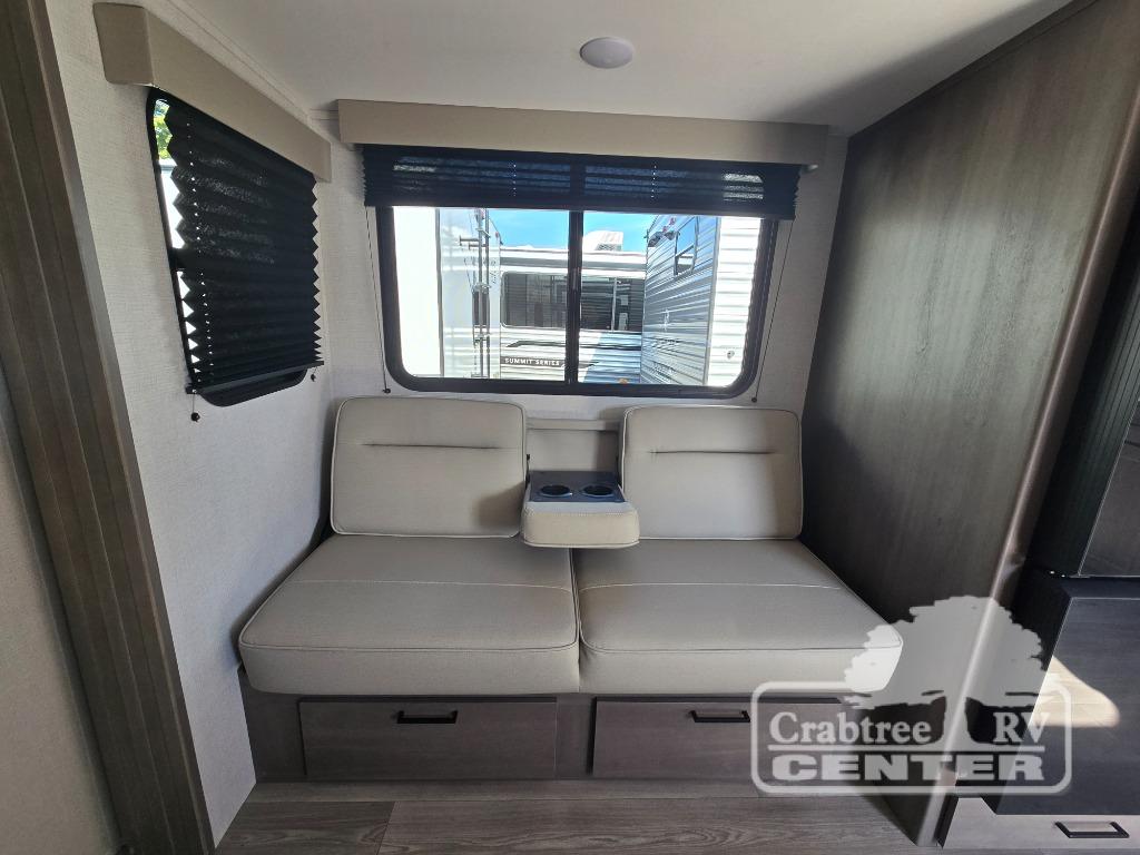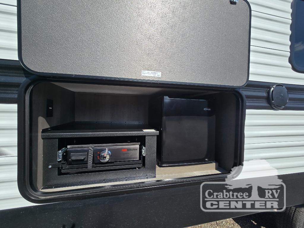 Camping with your larger family or when you want to take along a few extra friends is easy with this trailer. This unit sleeps nine with the double-size bunks in the rear corner, the 60" roll over sofa, and the queen bed in the front semi-private bedroom. The booth dinette can also be used to sleep a guest or two little ones at night once converted. Prepare your meals on the three-burner cooktop indoors, or out on the two-burner cooktop at the outside kitchen! You'll also find a handy exterior spray port and an outdoor refrigerator for cold drinks! It will be so easy to fill the dog's food bowl with the added pet dish under the refrigerator, and the full bath in this model means you don't have to use the camp's facilities. Having a 17' awning outside along with a large unobstructed pass-through compartment allows you extended living outdoors and plenty of space for all of your gear!
