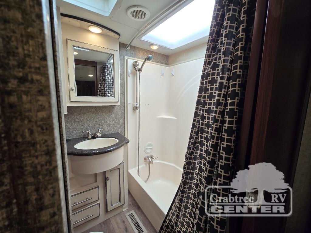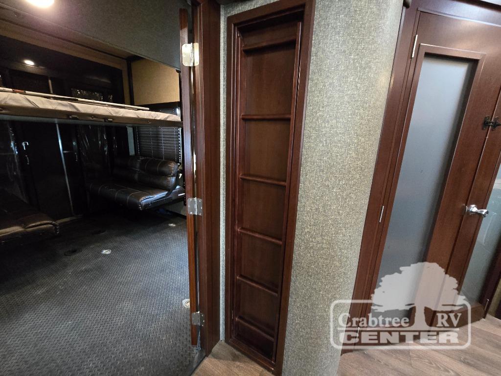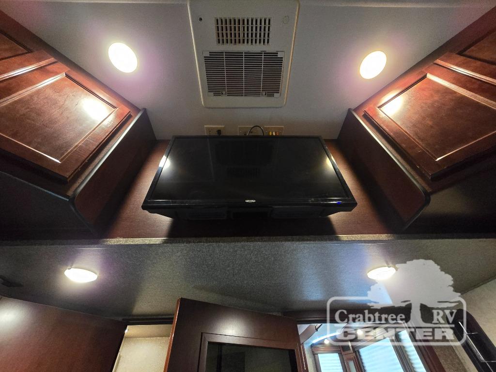 Just inside the main entry door you can step up to a side aisle bath and front bedroom. The bath features a toilet, sink and sunken tub. The private bedroom in front feature a slide out king size bed, a front wardrobe with sliding doors, and a large dresser for even more storage, plus a TV mounted on a sliding bar. There is also a closet with washer dryer prep, plus so much more.