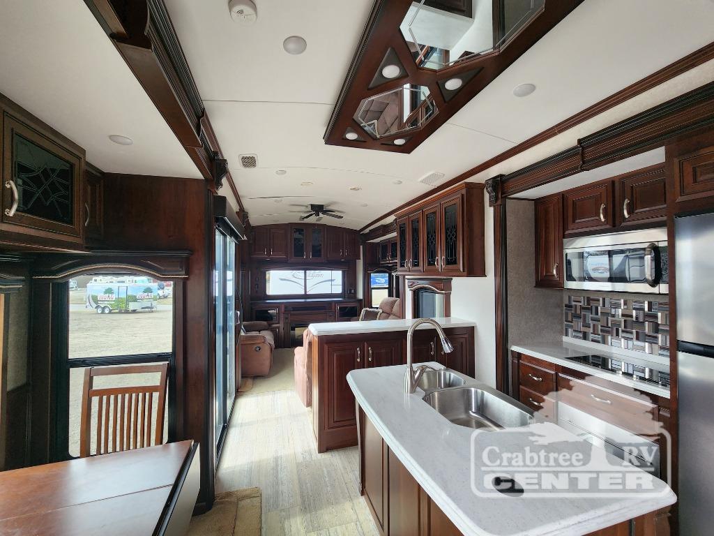 This Designer features FIVE slides, a fireplace, a kitchen island, king size bed, a patio door, plus so much more!