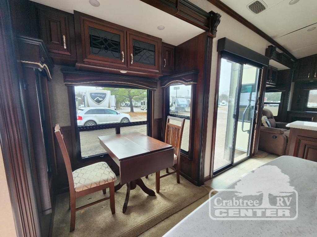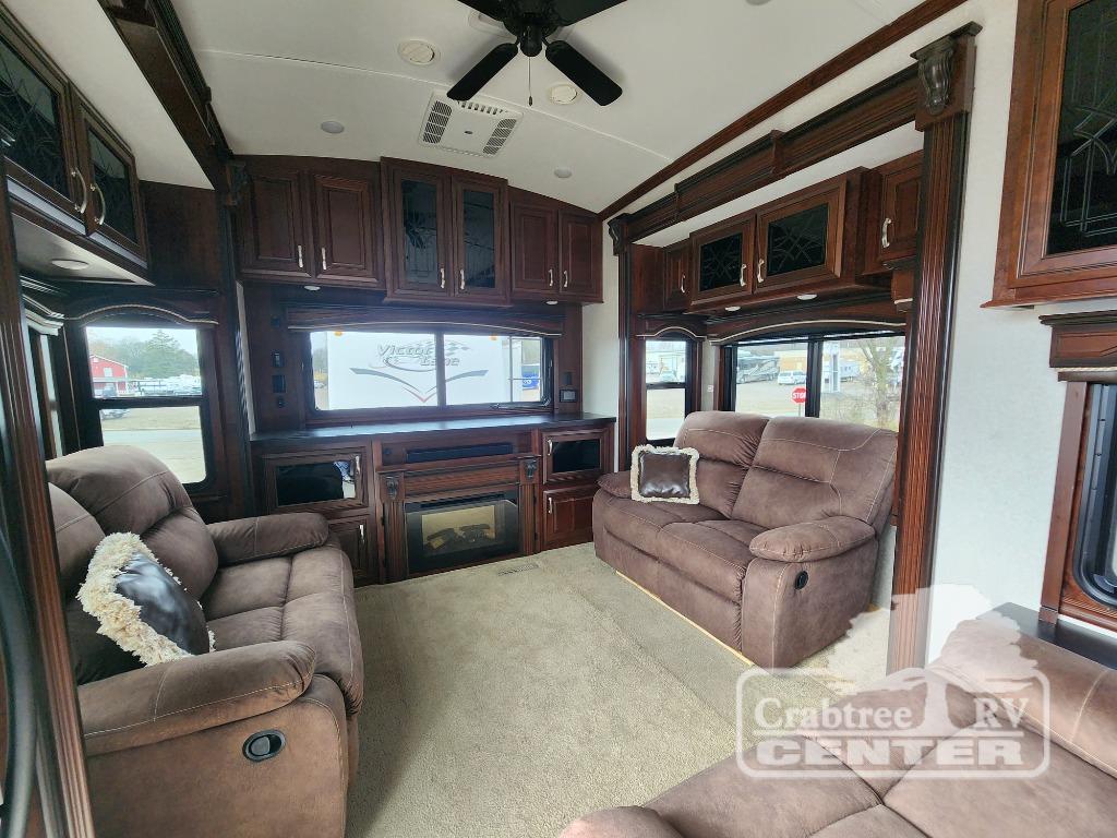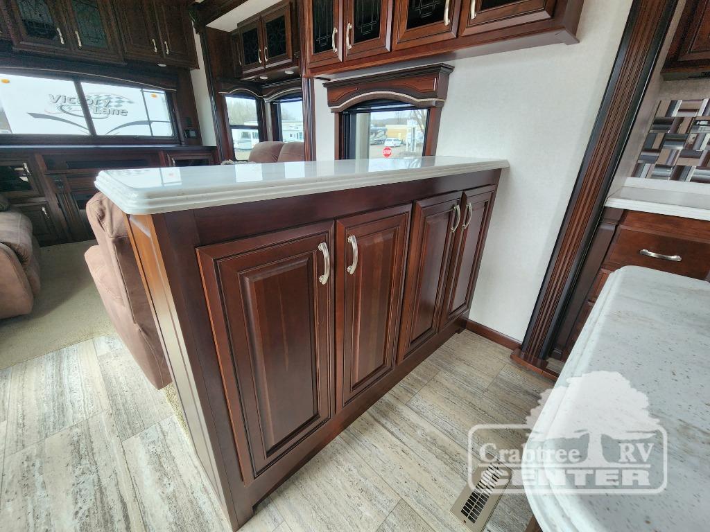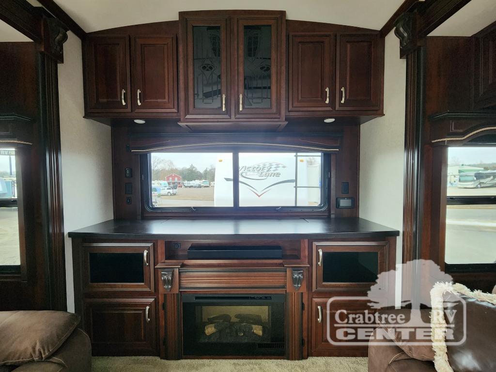 Enter through the 60" sliding patio door and notice the rear entertainment area with dual opposing slides. The road side slide features a tri-fold hide-a-bed sofa with ottoman, while the other slide features a bi-fold hide-a-bed sofa. There is also a power theater sofa for two with overhead cabinets above all three seating areas. The full rear wall entertainment center features a TV lift and a fireplace beneath to enjoy. This room is perfect for entertaining family or friends, and provides added sleeping space if any decide to spend the night!
