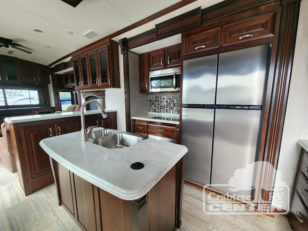 To the right of the patio doors there is a spacious kitchen area with dual opposing slide outs like the living area. A table/desk combination with four chairs fills the slide along the curb side, and the slide opposite features a residential refrigerator, a two burner range with overhead microwave oven, and a dishwasher. There is a bar top along the inside wall with storage below, a kitchen island featuring double sinks, and more storage along the inside wall in this kitchen area.