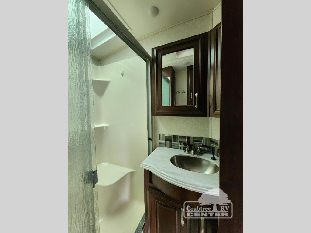 Head up the steps toward the front to a side aisle bathroom on the left. There is a toilet, a vanity sink with overhead medicine cabinet, linen storage, and a 36" x 48" shower.