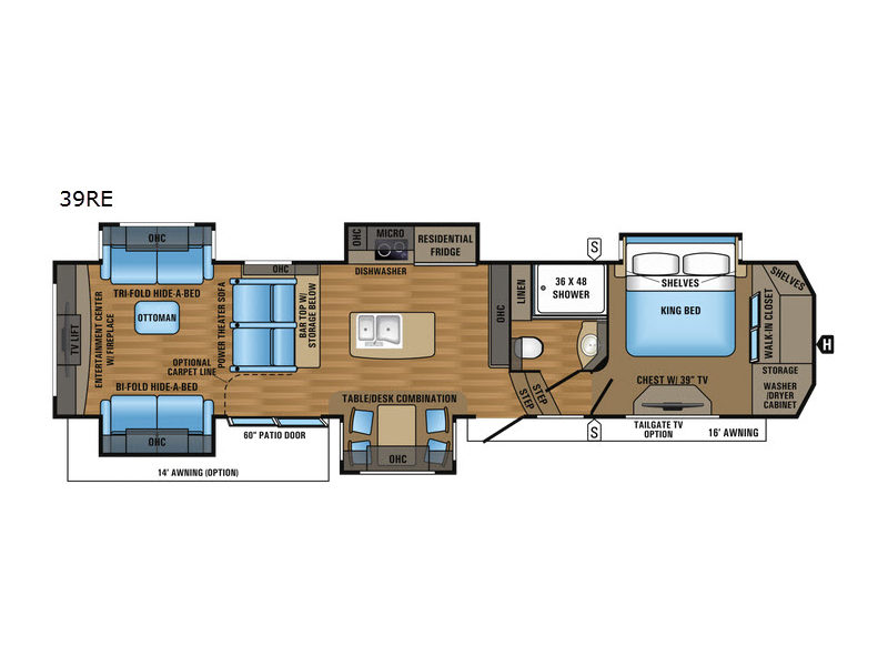 The very front features a spacious bedroom retreat with a king size slide out bed including shelves on both sides. A chest with 39" TV lift opposite, and a front walk-in closet are perfect for your clothing. There is also a corner cabinet for a stackable washer and dryer if you choose to add, plus so much more!
