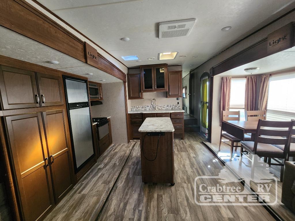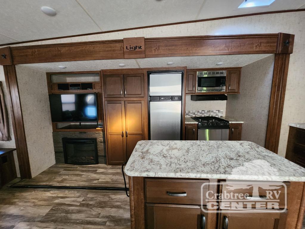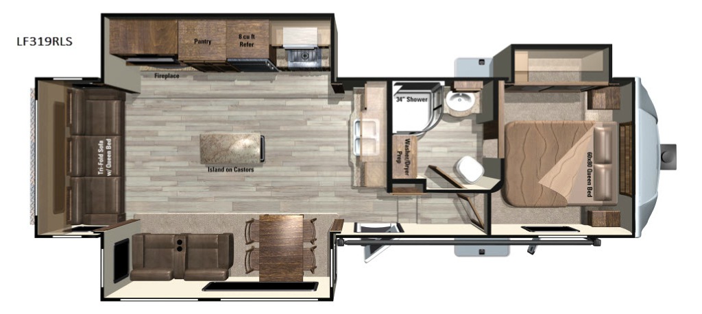 This Open Range Light fifth wheel model LF319RLS features triple slides, a rear living layout with a fireplace, a convenient kitchen island on castors, and so much more!