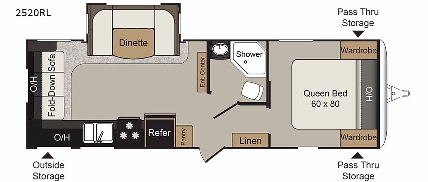 If you are a couple or family of four to five, this Passport 2520RL Grand Touring might just be the perfect travel trailer for you. If you have been thinking about how you can travel around to see new places with your own accommodations, step inside. You will find your own private bedroom on one side of the trailer, and a conveniently located full bathroom across from the main entry. The rear living area offers seating and dining, plus extra sleeping space for the kids or grandkids. You can make meals, store your perishables, and even take larger items in the pass-through storage outside. Come see what else will make your experiences in the RV world enjoyable.