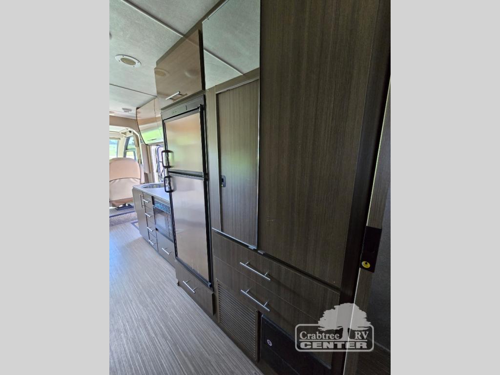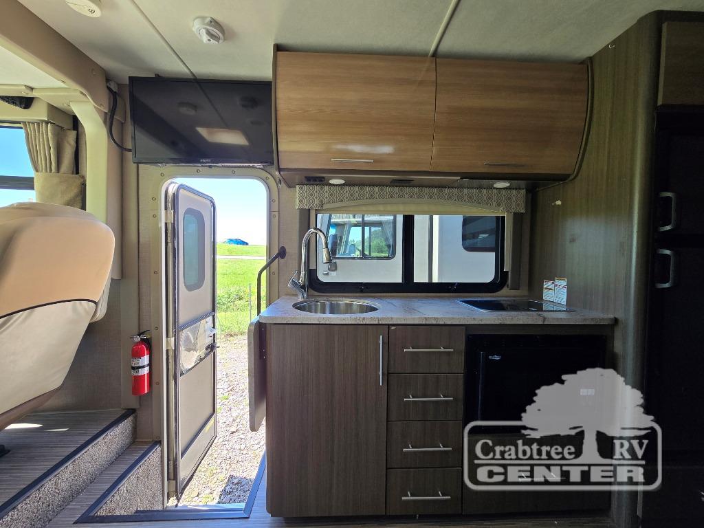 To the left of the main entry door find a round sink, counter space with a flip-up top extension, a two burner range with microwave below, plus a pull-out pantry and refrigerator for your food items. You will find it quite simple to create light meals and snacks.