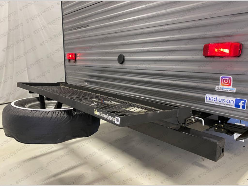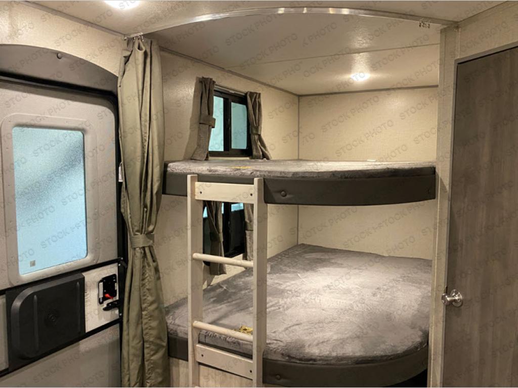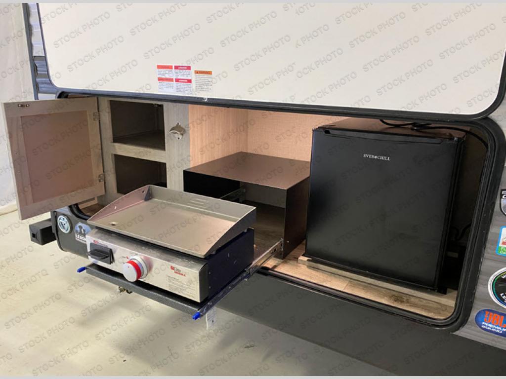 When you enjoy camping with your own accommodations and space for the whole crew, hitch this trailer up and head to the campgrounds! After loading everything easily thanks to the dual entry doors and all the interior and exterior storage, you will have no worries that you left anything behind. The electric awning is easy to setup like the large slide out, and the awning offers multicolor LED lights to choose from by using the remote. When you are outside the cook might like to make a meal using the outside camper kitchen. The interior kitchen offers full amenities including a pantry, and everyone can watch the 39" TV on the angled entertainment center. There are double-size bunks with a ladder for the kids and a walk-around queen for the owner to sleep on, as well as the furniture doubles as extra sleeping space.