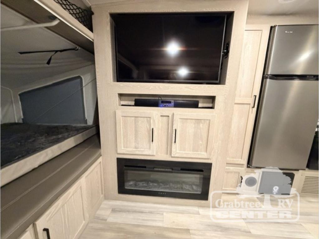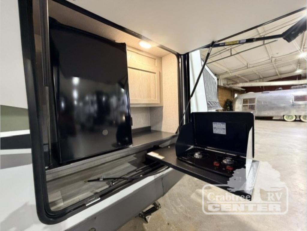 You will feel right at home in this spacious expandable thanks to the large slide out and the fireplace with an LED TV. There is a full kitchen with a three burner cooktop, a 12V refrigerator, plus a microwave oven, and if you enjoy cooking outdoors, you're going to love the outside kitchen! You'll also find an 18' power awning outdoors, along with three exterior storage compartments and Solid Step entry steps.