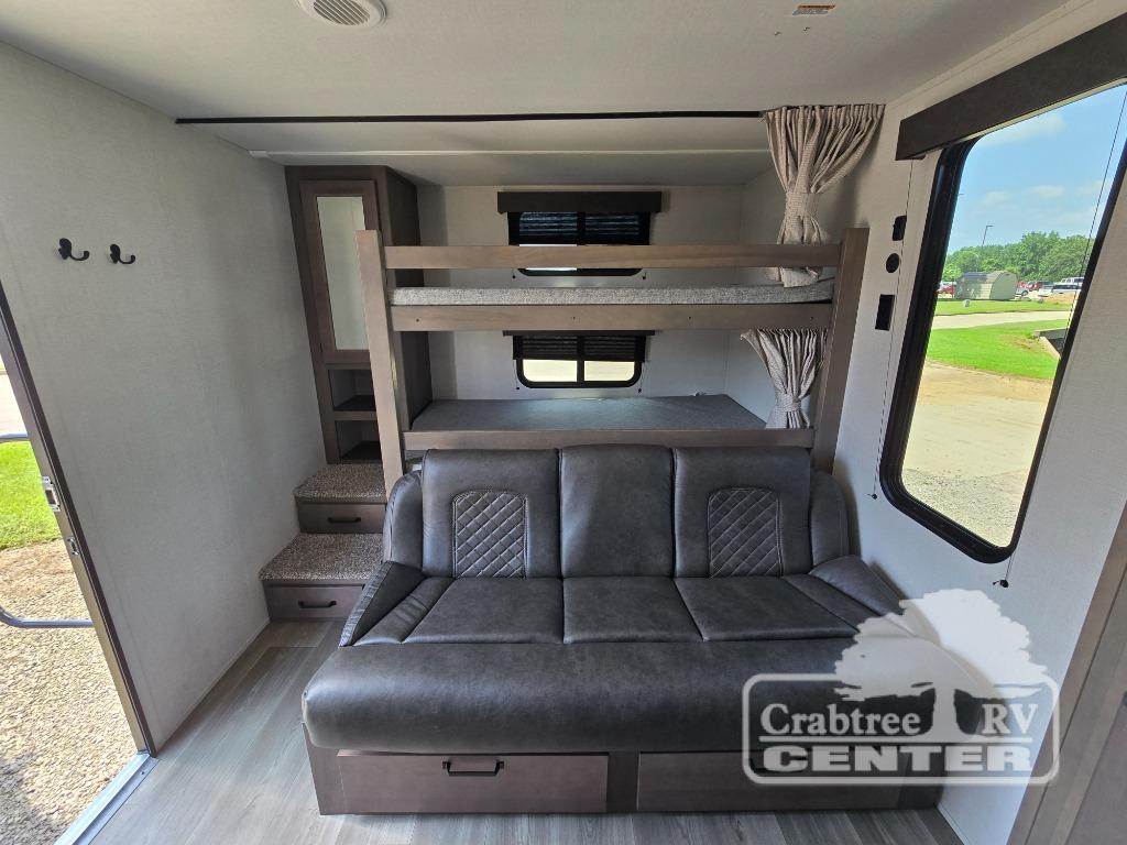Are you ready to camp in comfort with your family or friends? This travel trailer allows you to do just that! There are double-size bunks in the back with step storage for books or board games. There is also a closet here to keep clothes wrinkle-free. The large slide features a U-Shaped dinette which is perfect for everyone to gather for a meal or games, and there is also theater seating adjacent to the slide. This model features a walk-through bath that leads to the front master bedroom. You'll love the queen bed here, overhead storage, and your own exterior entry door for convenience.