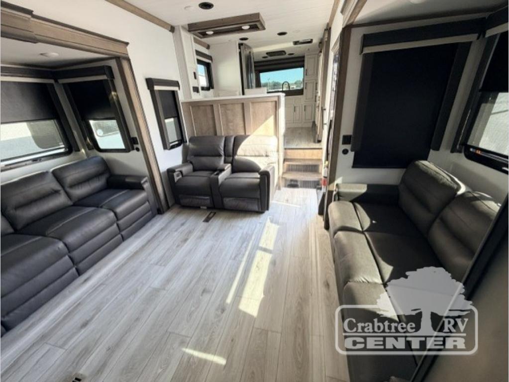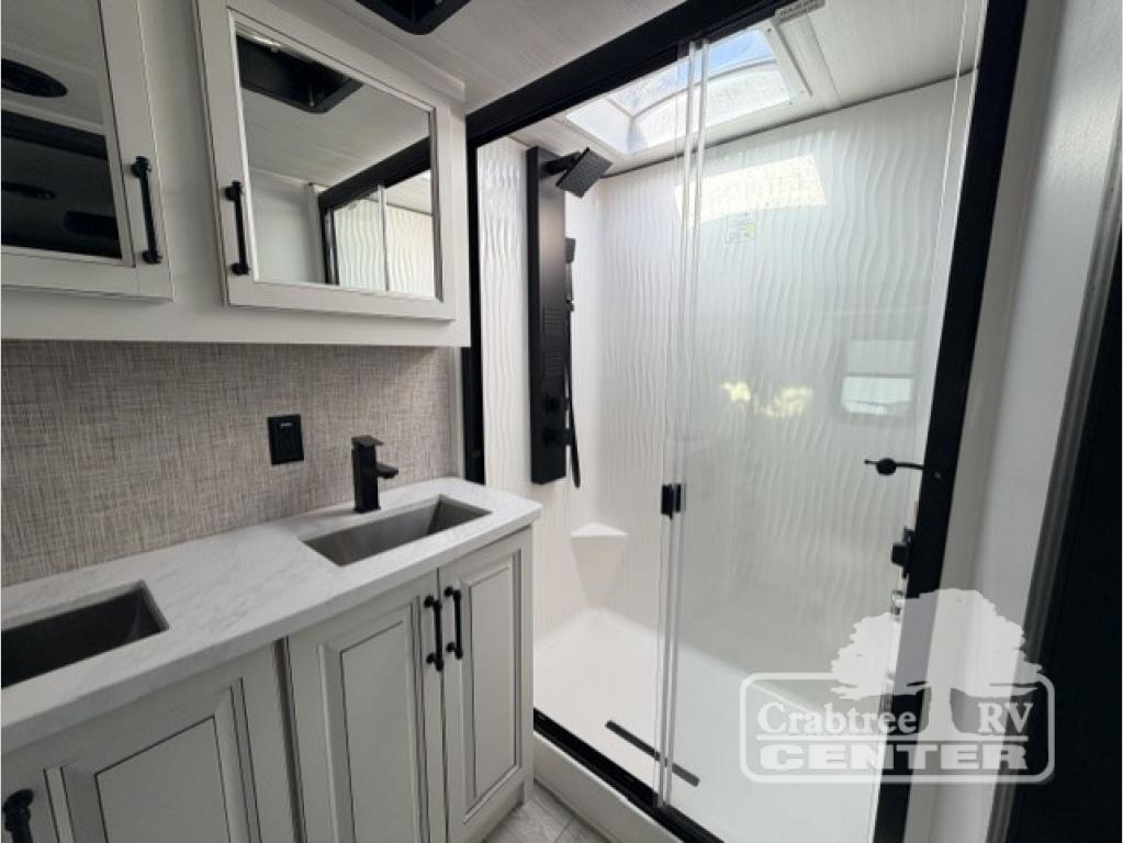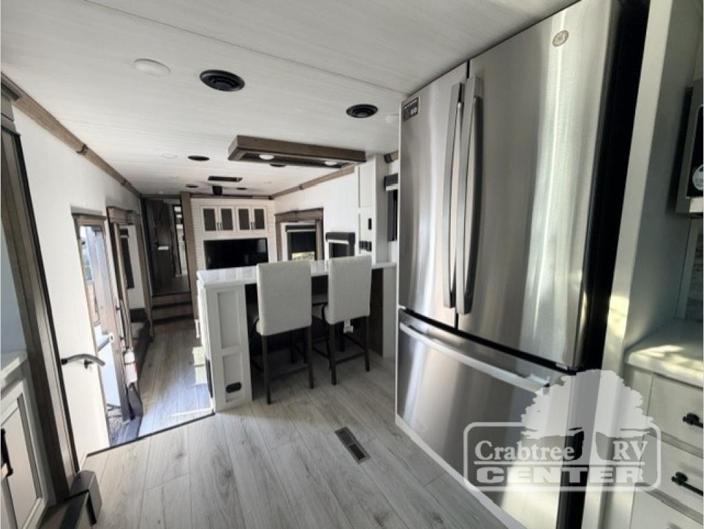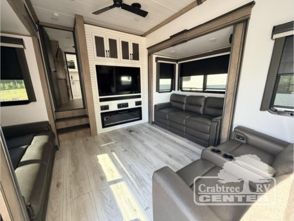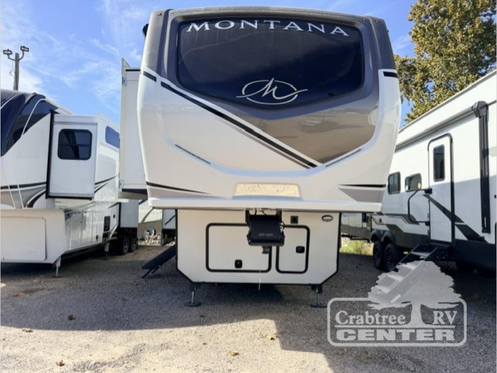The perfect RV when you like to take "home"' with you when you travel! This Montana fifth wheel gives you the space you want and it feels like home with plenty of features to love and keep you comfortable when you are out enjoying your adventures. Four slides in total give each space plenty of room, the raised front kitchen has everything you need to cook up meals and snacks just like at home. An 18 cu. ft. residential refrigerator with ice maker, convection microwave oven, and large sink, plus pantry space will make any chef happy. The mid-coach area just inside the door features a living room with dual opposing hide-a-bed slides as well as powered theater seating and a fireplace with Smart TV opposite. Step up in back to a bedroom with a king bed slide, a dresser, and closet featuring prep for a stackable washer and dryer. A sliding barn door leads into the rear spacious master bath featuring a 48" x 30" shower, a toilet, linen storage and a vanity with two sinks!
